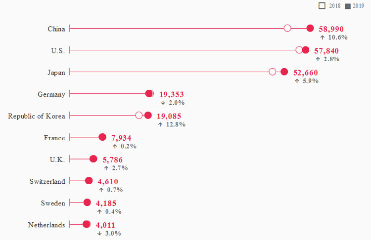 Общее количество заявок на патенты в 2019 году, поданных в ВОИС, выросло на 5 % до рекордного максимума в 265 800 штук, причем 52 % поступили из Азии, а 23 % — из Европы и Северной Америки. При этом на долю 50 крупнейших компаний из Китая, Японии и Южной Кореи пришлось 60 % заявок.
