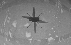 Например, команда опубликовала вторую чёрно-белую фотографию (тоже в разрешении 640 × 480 точек), сделанную навигационной камерой дрона, но уже непосредственно перед посадкой. На нём хорошо видна поверхность Марса и тень вертолёта, а в углах также можно заметить края посадочных опор. Специалисты сделали любопытное наблюдение: даже на этой близкой дистанции пыли, поднятой вертолётом, почти не видно — она совершенно не мешает наблюдению. В марсианской атмосфере поднять пыль винтами сложнее. Напомним: эта камера используется автоматикой, чтобы отслеживать поверхность при полёте.