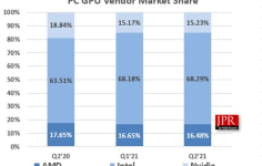 Рынок всех графических процессоров сократился последовательно на 0,3 %, при этом AMD сократила объёмы поставок на 1,0 %, как и Intel, а вот NVIDIA увеличила объёмы поставок на 3,9 %. Присутствие на рынке гибридных процессоров AMD позволяет этой компании удерживать 16,65 % рынка графических процессоров, превосходя NVIDIA с её долей в 15,17 %. Лидером же остаётся, как уже отмечалось, компания Intel с 68,18 % рынка графических решений.