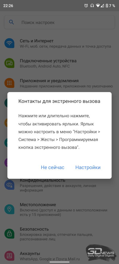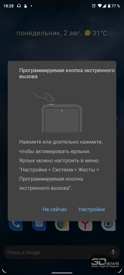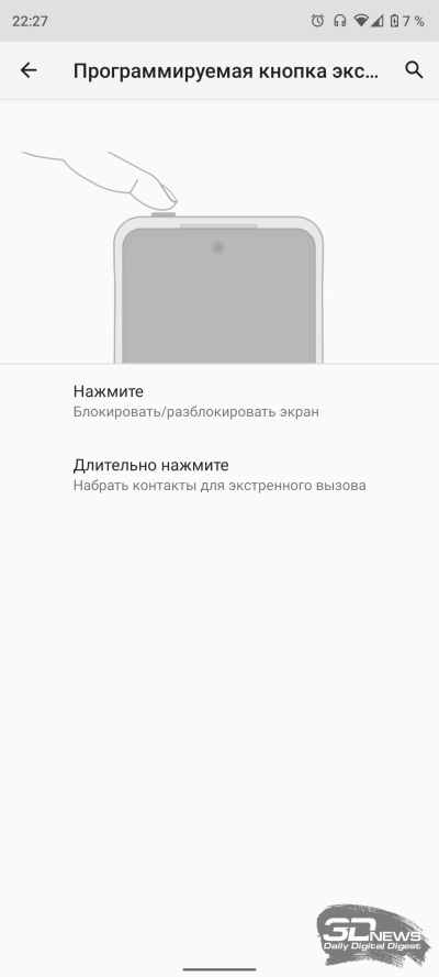 На Nokia XR20 больше органов управления, чем мы привыкли: кнопки блокировки/включения гаджета и регулировки громкости дополнены клавишей вызова Google Assistant и программируемой клавишей, обозначенной красным цветом. По умолчанию предлагается использовать ее для быстрого вызова экстренных служб, но можно выбрать и другие функции; переназначить кнопку можно в разделе «Система — Жесты — Программируемая клавиша». Путь неочевидный, поэтому указываю его здесь для тех, кто заинтересован в приобретении Nokia XR20. Еще один непривычный элемент на гранях корпуса — проушина для ремешка в нижнем левом углу.