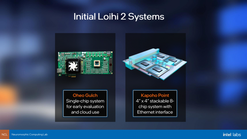 Первым устройством на базе Loihi II стала одночиповая карта Oheo Gulch, предназначенная для разработки и отладки ПО. Она пока что доступна только избранным партнёрам Intel в облаке Neuromorphic Research Cloud. Следующим устройством станет компактная (4” × 4”) плата Kapoho Point, которая несёт на борту уже восемь чипов Loihi II и предоставляет Ethernet и GPIO, а также различные интерфейсы для сенсоров и актуаторов. Платы можно будет напрямую объединять между собой для простого наращивания вычислительной мощности. В дальнейшем возможна интеграция чипов в гибридные SoC для различных задач, а также появление решений для ЦОД.