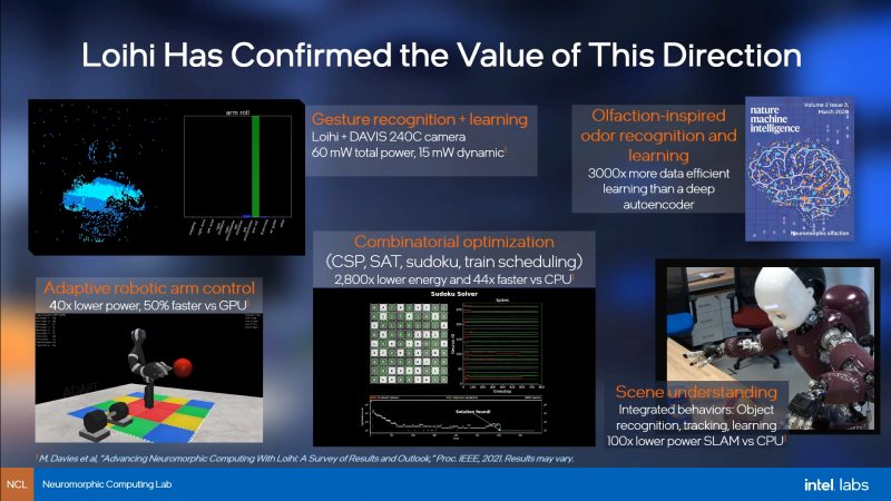 Суммарный эффект от всех нововведений таков, что Loihi II быстрее Loihi первого поколения примерно на порядок. Более того, он получил улучшенные возможности масштабирования: до 1000 ядер на самом чипе, а также можно сформировать трёхмерную mesh-сеть из чипов благодаря шести выделенным I/O-контроллерам на каждом из них и вчетверо более быстрым линиям. А для связи с внешним миром теперь доступны стандартные интерфейсы SPI/AER, GPIO и 1/2.5/10GbE.