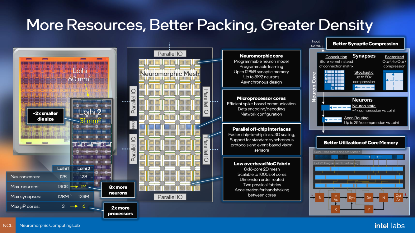 Loihi II изготавливается по EUV-техпроцессу Intel 4, который всё ещё находится в стадии разработки. Чип имеет площадь 31 мм2 и содержит 2,3 млрд транзисторов, а площадь одного ядра составляет 0,21 мм2, то есть плотность по сравнению с первым поколением выросла практически вдвое. Чип всё так же содержит 128 нейронных ядер, но число доступных нейронов выросло со 128 тыс. до 1 млн. Объём памяти на ядро слегка уменьшился, с 208 до 192 Кбайт, однако теперь банки памяти можно более гибко распределять между нейронами и синапсами, а компрессия позволяет ещё более эффективно использовать имеющийся объём.