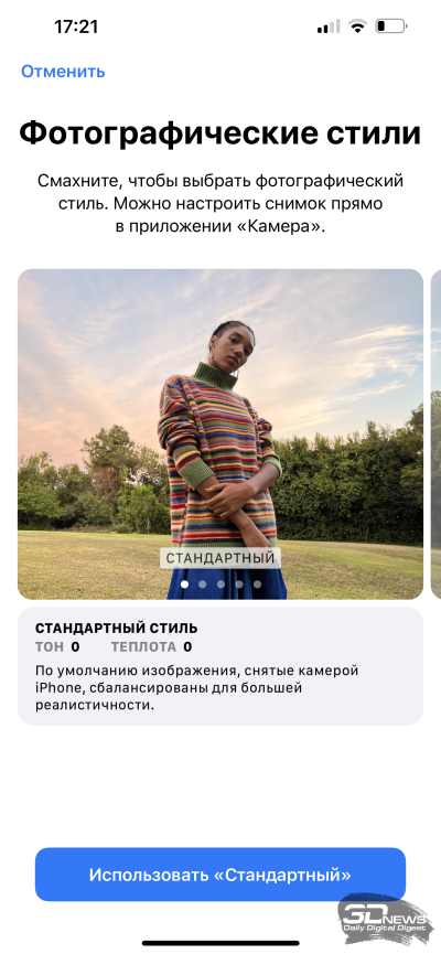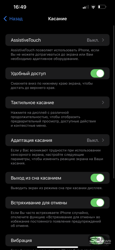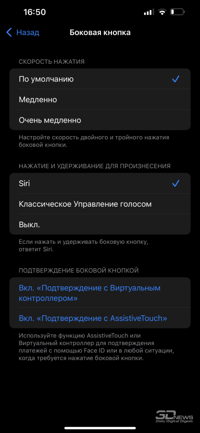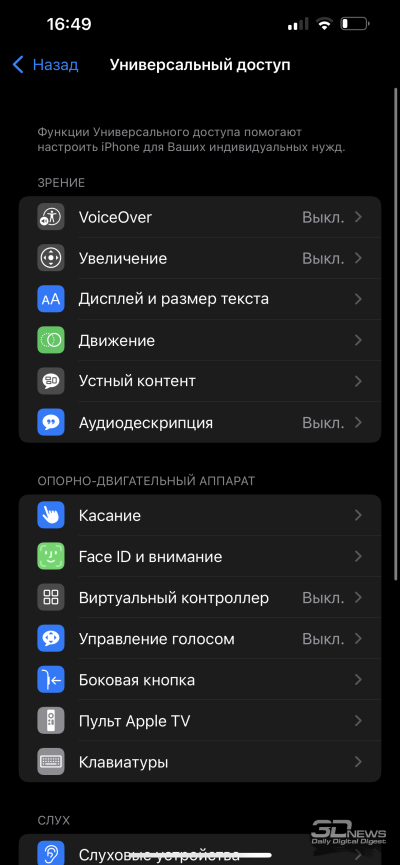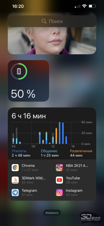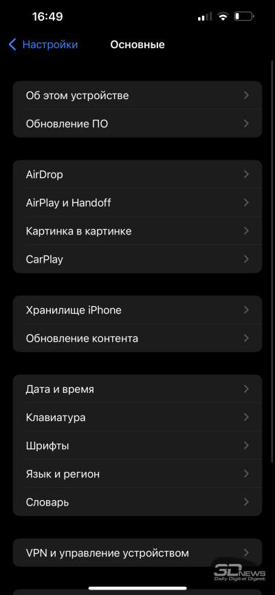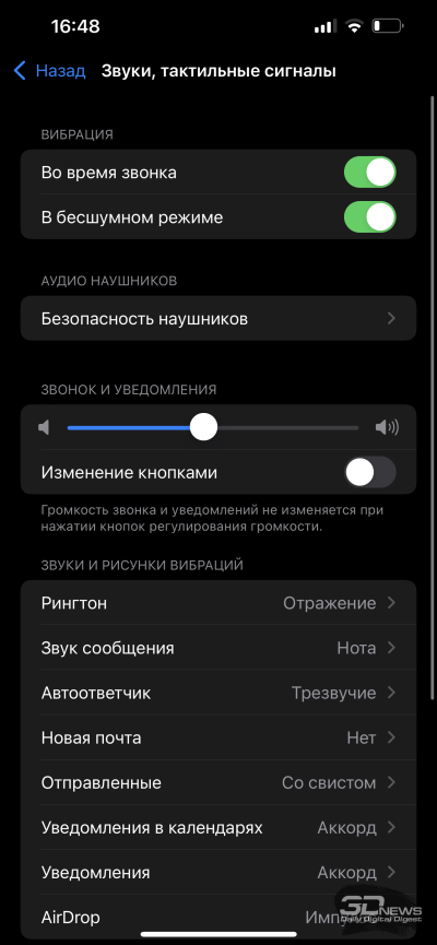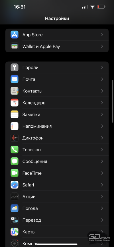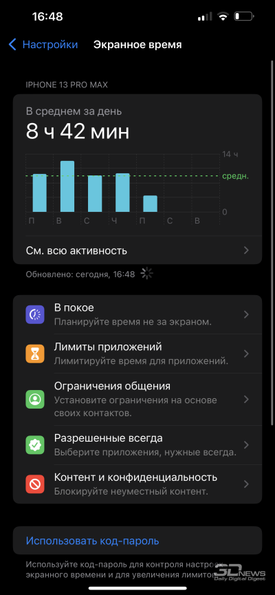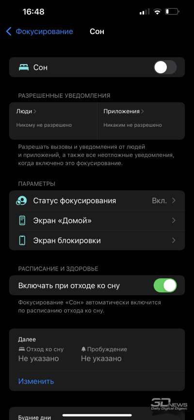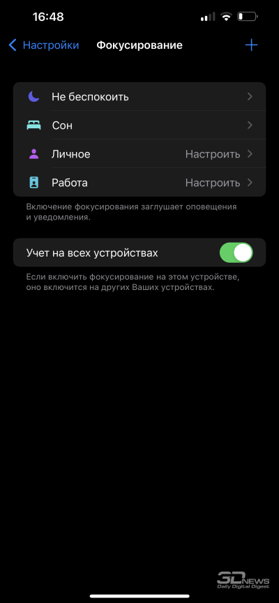 iPhone 13 Pro Max, левая грань: клавиши регулировки громкости, переключатель звуковых профилей, слот для SIM-карты Функциональные элементы не изменились: мини-джека нет, единственный разъем — по-прежнему Lightning, клавиша включения на правой грани, регулировки громкости и фирменный переключатель звуковых профилей — на левой. Самое важное, что нужно понимать о корпусе новых iPhone: клавиши на левом ребре слегка сместились вниз. Apple наверняка это обосновывает заботой об удобстве, но тут есть одно следствие — чехлы с двенадцатых моделей нельзя надеть на тринадцатые. Дизайн по сути не изменился, но будьте добры купить новые аксессуары. Новые iPhone, как и раньше, влаго- и пылезащищены по стандарту IP68. Про идентификацию пользователей я уже сказал чуть выше: сканер отпечатков пока не возвращается на iPhone и непонятно, когда вернется. В принципе, не беда: экранные сканеры в своем нынешнем виде — не то, по чему сильно скучаешь, хотя они и улучшаютсяпостепенно. Но у надежной, проверенной и быстро работающей системы Face ID все еще существует проблема, здорово надоедающая в пандемийную эпоху: она не может опознать ваше лицо, если вы надели медицинскую маску. Приходится то и дело снимать ее в общественных местах — или вводить пароль. ⇡#iOS 15Новая версия мобильной операционной системы Apple, как и сами смартфоны, в этот раз изменилась не так значительно, но внимания ее обновление тоже заслуживает. Во-первых, обновился фирменный мессенджер FaceTime – теперь можно делиться в нем экраном своего смартфона, а также отправлять ссылки на беседу, которыми могут воспользоваться пользователи Android и Windows через браузер. Ура, долой внутриплатформенные резервации! Также представлена функция SharePlay, с помощью которой можно смотреть видео или слушать музыку с кем-то вместе, но она пока недоступна. Расширены возможности режима «Не беспокоить», который теперь называется «Фокусирование», можно назначить различные сценарии с гибкими параметрами. Интересно, но чуть усложнено, как и в случае с будильником, глубоко спрятанным в режиме «Сон». Куда более удобно выглядит «Сводка уведомлений». Теперь более важную часть уведомлений можно оставить без изменений — вы их увидите, когда они приходят. А часть менее важную — отправить в «сводку», которую смартфон будет предоставлять дважды в день. Очень удобно: меньше надоедающих вибраций и отвлечения на мало значащие (но не настолько, чтобы совсем отключить уведомления) приложения. IOS 15