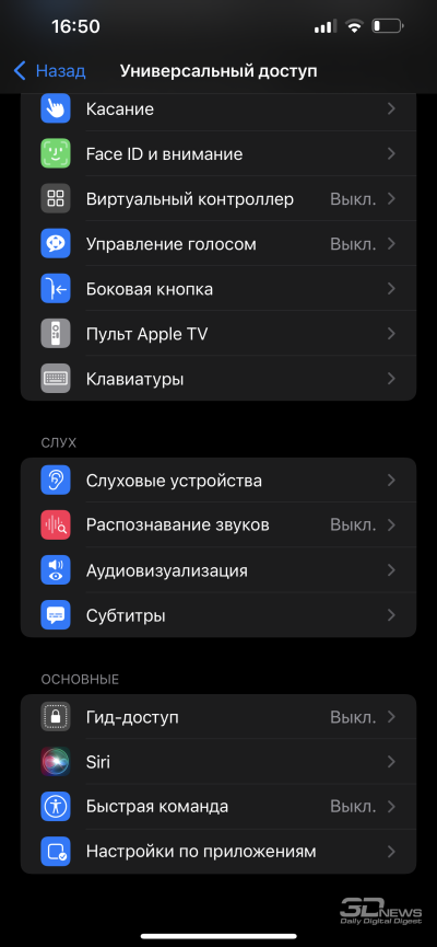 Смотреть все изображения (24) Также в iOS 15 сильно изменился интерфейс браузера Safari, появилась возможность копировать текст, снимаемый камерой, в онлайн (только английский), представлен сервис iCloud+, по мелочи обновили ряд приложений (от «Погоды» до «Сообщений»). Работает операционная система на новых iPhone, как обычно, стабильно и быстро — никаких вопросов. ⇡#Дисплей и звукВсе новые iPhone получили обновленные дисплеи (у всех «тринадцатых» OLED), но степень обновления у них разная. На iPhone 13 установлен OLED-дисплей диагональю 6,1 дюйма и разрешением 2532 × 1170 точек (Super Retina XDR, плотность пикселей 460 точек на дюйм). К сожалению, важнейшая фишка нового поколения досталась только Pro-версии — экран обычного iPhone 13 работает на фиксированных 60 герцах. Отличие от прошлой версии по сути одно — повышенная пиковая яркость. Apple утверждает, что пиковая яркость при просмотре HDR-контента достигает 1200 кд/м². Зафиксировать этот уровень инструментально с нашей методикойне представляется возможным — это «умная» яркость с неотключаемой автоматической регулировкой пика. Мы всегда проводим тестирование экрана с искусственным светом — и здесь оба новых iPhone демонстрируют стандартные показатели: 489 кд/м² — Pro Max, 448 кд/м² — iPhone 13. При тестировании статической яркости днем цифры возрастают значительно, но опять же не дотягивают до заявленных 1200 кд/м². Так что остается просто принять это на веру. Тем более что оснований не верить этому нет — экраны обоих iPhone очень уверенно себя ведут даже на самом ярком солнце, сохраняя свободную читаемость. Дисплей iPhone 13 Pro Max построен на базе OLED-панели диагональю 6,7 дюйма (6,68 дюйма, если быть максимально точным) с разрешением 2778 × 1284 (Super Retina XDR, 458 пикселей на дюйм). Помимо повышенной яркости (цифры заявлены те же, что и на обычном iPhone 13) он также умеет работает с повышенной частотой обновления — 120 Гц. По умолчанию она включена, переключиться на стандартную частоту (которая заметно снизит плавность скроллинга) можно в настройках, но не экранных, как можно было бы подумать, а во вкладке «Универсальный доступ — Движение». Иногда Apple выстраивает работу со своими смартфонами контринтуитивно. Остальные настройки дисплея стандартны для iOS — вручную настроить цветопередачу нельзя, можно лишь включить/выключить режим автоматической подстройки цветов под внешнее освещение True Tone, выбрать светлую или темную тему оболочки, активировать ночной режим и «поиграть со шрифтами». Мы измерили цветопередачу дисплея как с True Tone, так и без этой надстройки — и в этот раз получить идеальную картину цветопередачи у меня не получилось. Дело в том, что экраны iPhone настроены в первую очередь под работу с расширенным цветовым диапазоном P3, но экран переключается на широкую цветовую гамму только при отображении соответствующего контента. Наши же тестовые паттерны предполагают гамму sRGB, а с ней смартфон работает уже не настолько корректно. Тем не менее предлагаем вашему вниманию результаты измерений.