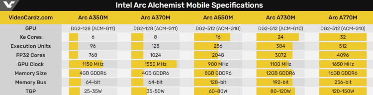 Мобильные графические ускорители Alchemist построены на базе процессоров ACM-G10 (до 32 ядер Xe) и ACM-G11 (до 8 ядер Xe). Модели Arc A550M, Arc A730M и Arc A770M используют чипы ACM-G10, которые предложат до 4096 ядер для обработки операций одинарной точности (FP32). В свою очередь модели Arc A370M и Arc A350M используют процессоры ACM-G11 с 768 и 1024 ядрами FP32. Данный процессор фигурировал в прошлых утечках под маркировкой DG2-128EU.