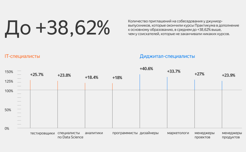 Разработчики, окончившие курсы дополнительного образования в Практикуме, получают на 38 % больше приглашений на собеседования по сравнению с теми, кто не заканчивал никакие курсы.