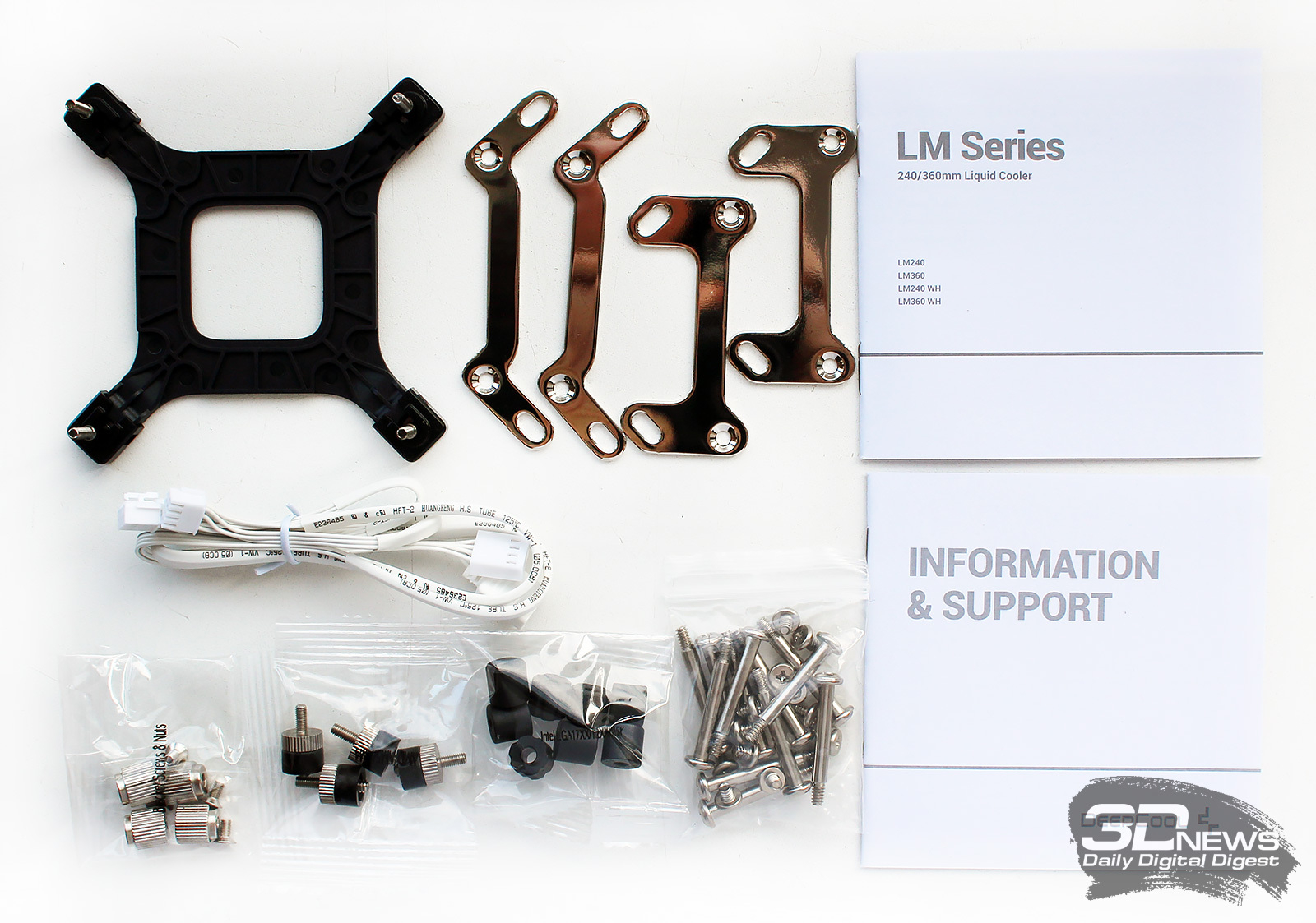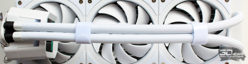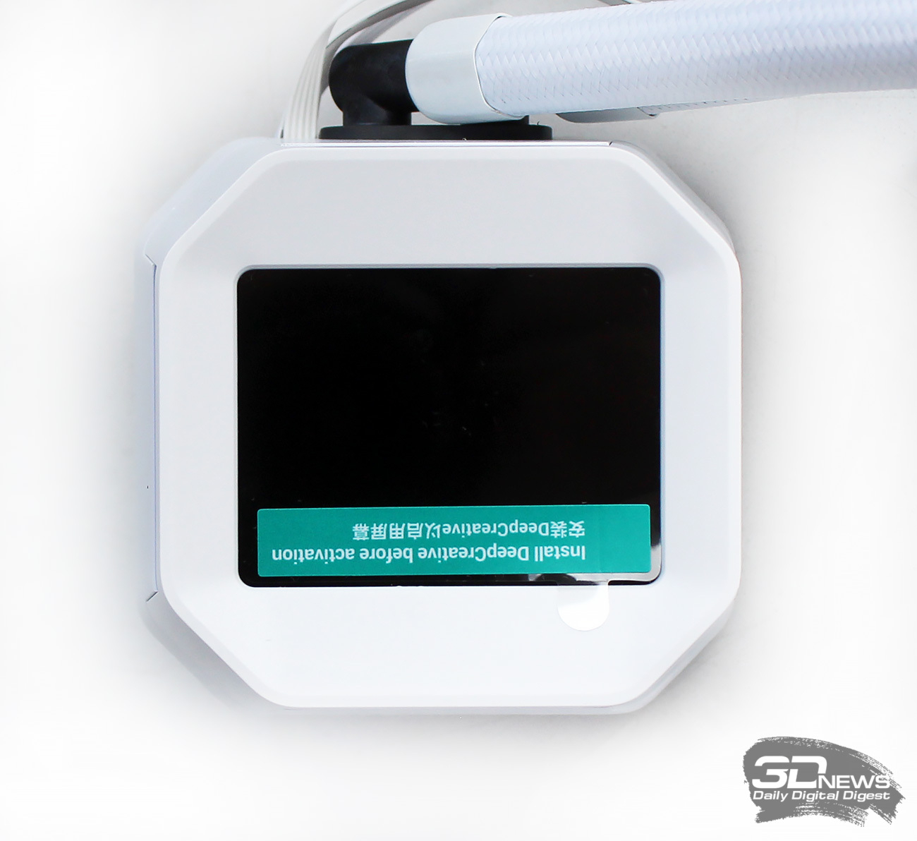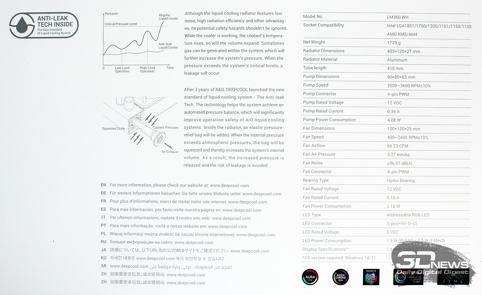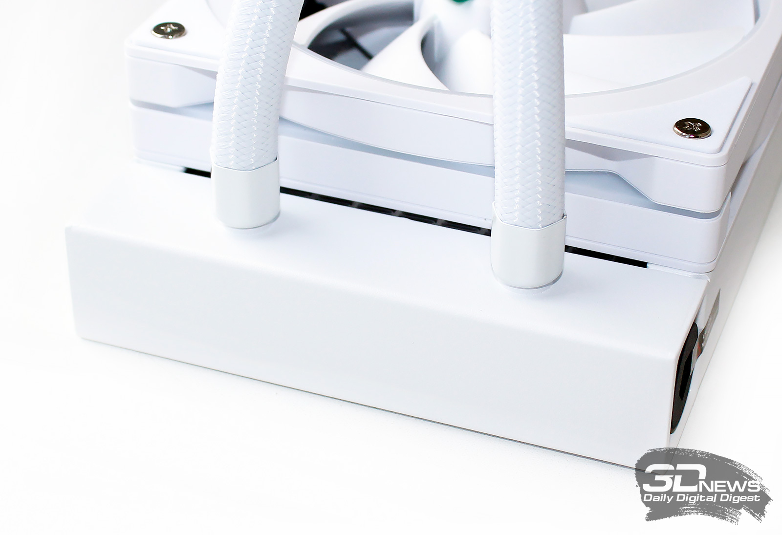 Упаковка и комплектация DeepCool уже давно не изменяет стилистику и размеры коробок для своих систем жидкостного охлаждения. Вот и LM360 WH поставляется в картонной коробке средних размеров, которая вставлена в сдвижную белую оболочку с изображением системы на лицевой стороне. На противоположной стороне коробки описан принцип работы клапана системы защиты от протечек Anti-leak и приведены технические характеристики СЖО. В картонную коробку вставлена оболочка из вспененного полиэтилена с отсеками под компоненты СЖО. Самый крупный из них – радиатор с вентиляторами – дополнительно защищён картонными пеналом и пакетом. Отдельно запечатаны комплектующие LM360 WH. Среди них пластиковая усилительная пластина, отполированные до блеска две пары стальных направляющих, кабель для вентиляторов, четыре пакетика с винтами, втулками и гайками, а также инструкция по установке и гарантийная памятка. Термопасты в комплекте нет, так как она сразу же нанесена на основание водоблока, что удобно, но только на один раз. Страной производства DeepCool LM360 WH является Китай. В России данную модель СЖО уже можно приобрести, причём стоимость оказалась на редкость демократичной для систем с экраном на помпе – около 8000 рублей в зависимости от магазина. Гарантия – 36 месяцев. ⇡#Особенности конструкцииDeepCool LM360 выпускается в чёрном и белом цвете, у нас на тестах белая версия с индексом «WH». Охладитель представляет собой классическую систему жидкостного охлаждения необслуживаемого типа с 360-мм радиатором, тремя 120-мм вентиляторами, парой шлангов и блоком помпы и водоблока. В плане дизайна СЖО обращают на себя внимание белоснежные вентиляторы с оригинальными крыльчатками и крышка помпы с матовым стеклом.