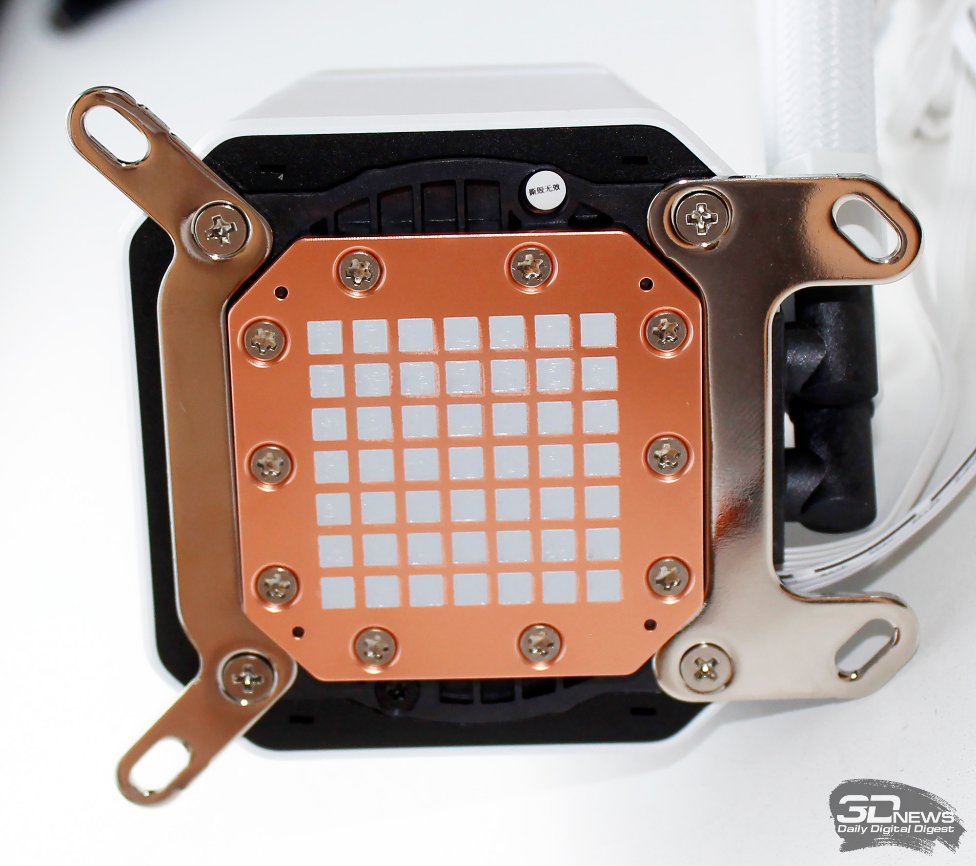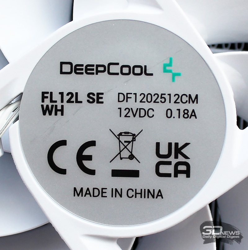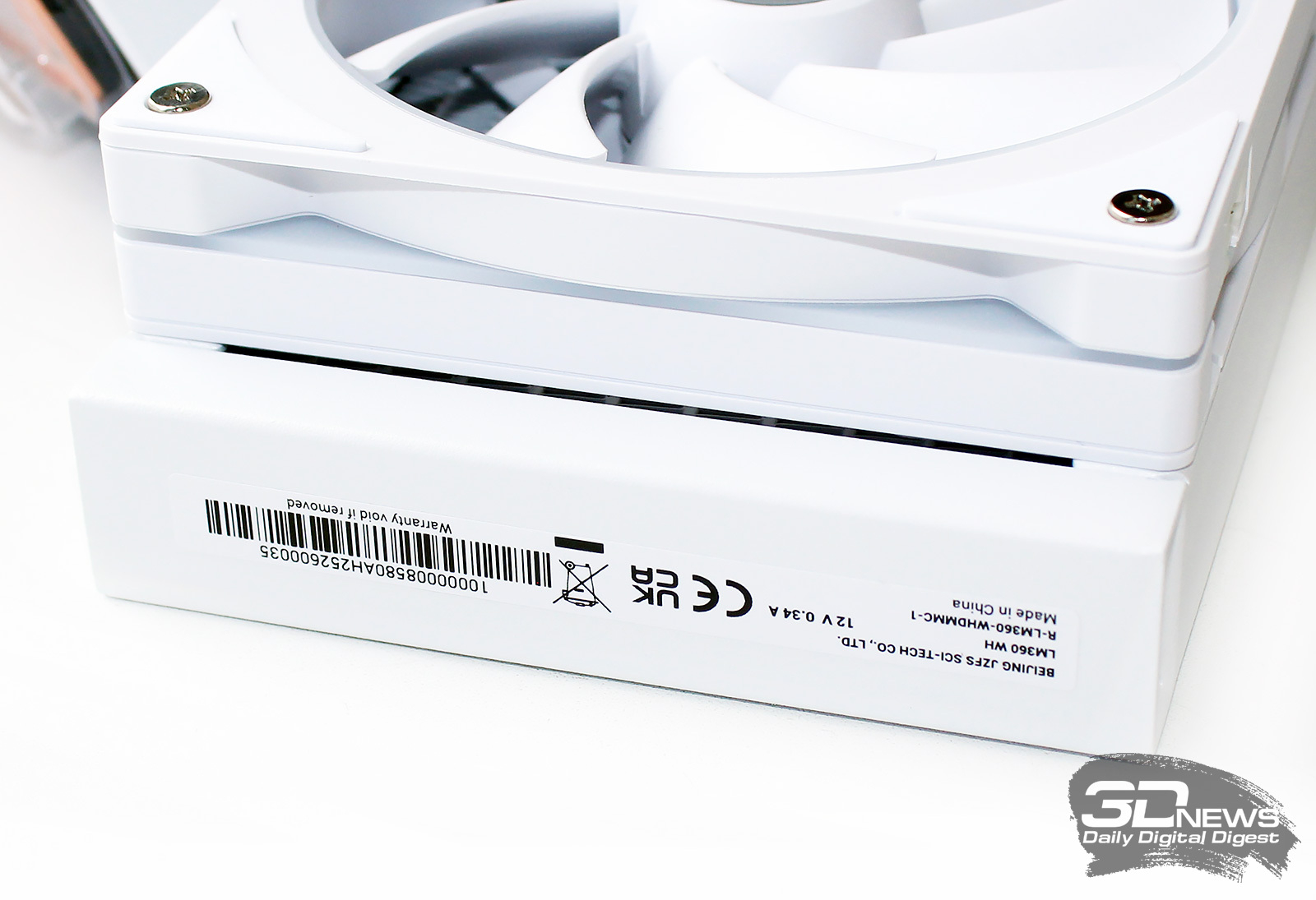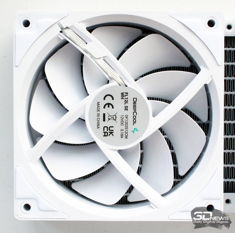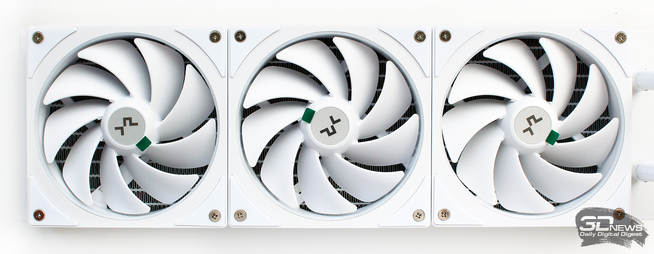 05_dcLM360_fr 06_dcLM360_frr Размеры радиатора равны 402 × 120 × 27 мм, общая масса системы составляет 1622 грамма (без учёта креплений). Алюминиевый радиатор состоит из 12 плоских каналов, между которыми приклеена перфорированная лента, собранная в гребёнку, и по которым прокачивается теплоноситель. Толщина алюминиевого оребрения в радиаторе равна 20 мм, а плотность радиатора составляет стандартные 20~21 FPI. Из увеличенного танка радиатора выходят два статичных фитинга, на которых опрессованы шланги. На противоположном торце радиатора (чуть меньшего размера) можно увидеть наклейку с указанием модели СЖО, страны производства и штрих-кодом. Также на торце радиатора выделим клапан фирменной системы защиты от протечек Anti-leak, регулирующей давление внутри контура СЖО в целях сведения к минимуму вероятности протечек. Резиновые шланги, соединяющие радиатор с помпой, облачены в нейлоновую оплётку, минимизирующую испарение теплоносителя. Их внешний диаметр не превышает 12 мм, а внутренний (предположительно) равен 6 мм. Длина шлангов от фитинга до фитинга равна 390 мм. Резюмируем, что всё вышеперечисленное в новой DeepCool LM360 WH вообще ничем не отличается от радиатора и шлангов, например, модели LQ360, протестированной нами в декабре прошлого года и используемой с тех пор в качестве эталона. То есть основа у этих систем жидкостного охлаждения одинаковая. А вот дальше будут отличия. Первое нововведение – это помпа. Она выполнена в дизайне «Звездных войн» (ну или мне так показалось) и имеет размеры 90 × 80 × 63 мм. В DeepCool заявляют, что в LM360 используется помпа шестого поколения (у LQ360 – пятого) с 3-фазным, 6-слотовым, 4-полюсным электромотором с векторной системой управления, регулирующей скорость вращения ротора в диапазоне от 2500 до 3400 об/мин. По данным мониторинга, максимальная скорость ротора помпы – 3390 об/мин, а уровень энергопотребления – 3,3 Вт. Производительность помпы в её характеристиках традиционно не указывается, а в случае с помпой LM360 не указан ещё и нормативный срок службы подшипника помпы. В крышку помпы встроен IPS-экран мониторинга диагональю 2,4 дюйма с разрешением 320×240 пикселей, работу которого мы продемонстрируем в следующем подразделе статьи. Судя по форме основания и крепежным винтам, медный водоблок в системе DeepCool LM360 WH не претерпел изменений. Он микроканальный и, скорее всего, также оснащён пластиной-ламелью для фокусировки потока жидкости в центр рёбер водоблока. Изменилось только нанесение термопасты на основание водоблока: теперь она распределена не сплошным слоем, а маленькими квадратиками. Наряду с элементарной экономией термопасты, такой подход позволил достичь более тонкого слоя термоинтерфейса при контакте с процессором и его более равномерного распределения. Отпечатки у нас получились, попросту говоря, эталонные. И это несмотря на, напомним, выпуклый теплораспределитель тестового процессора конструктивного исполнения LGA1700 (Intel Core i9-13900K). Вторым после помпы нововведением в DeepCool LM360 WH являются вентиляторы DeepCool FL12 SE. Это новая разработка китайской компании с упором на подсветке, подсветку, подсветку, встроенную не только в окружность крыльчатки, но и в периметр рамки. Сами же вентиляторы выполнены в типоразмере 120 мм, оснащены девятилопастной крыльчаткой диаметром 105 мм (уменьшен как раз из-за подсветки) и конусообразным статором диаметром 38 мм.