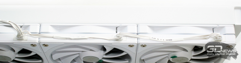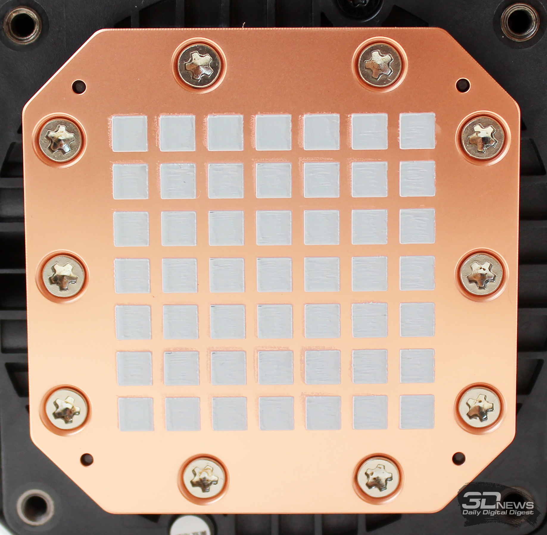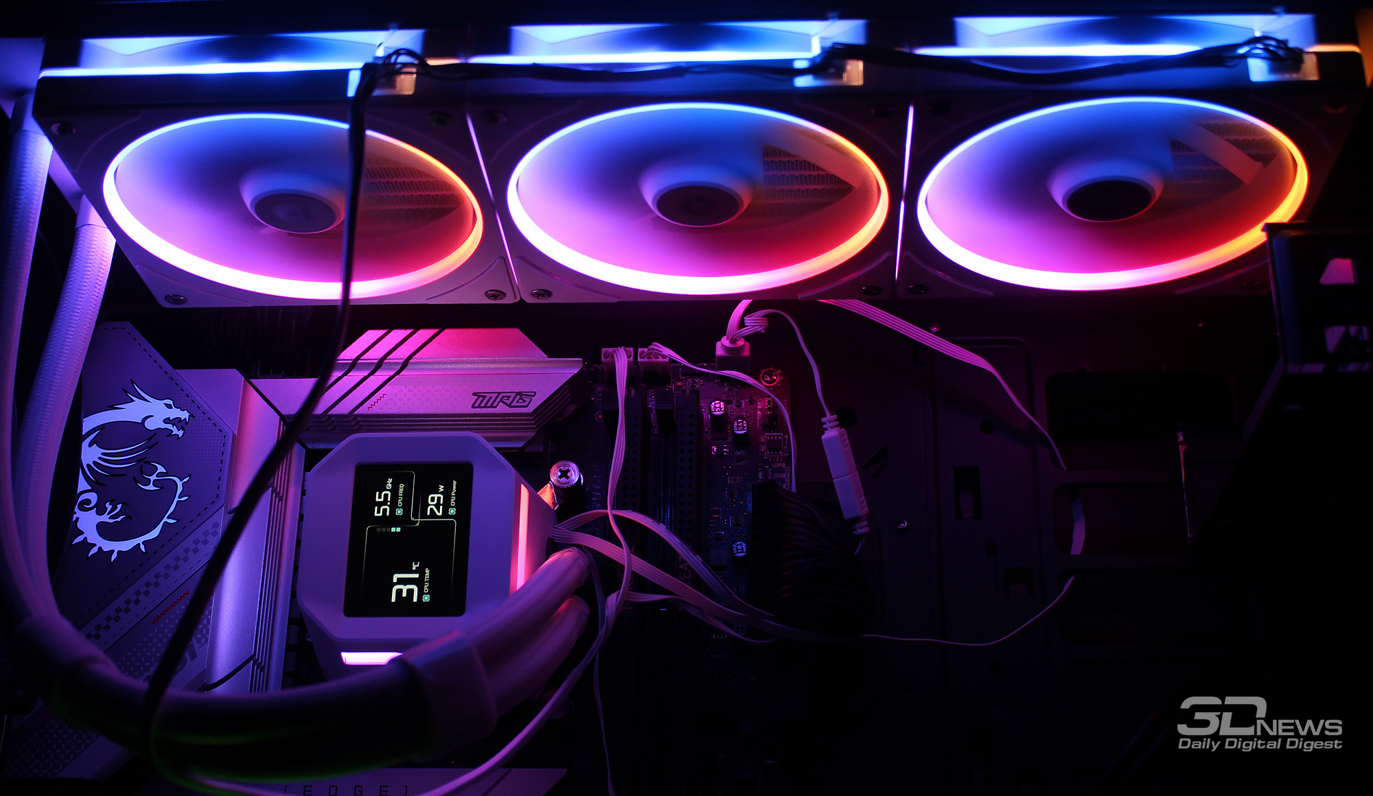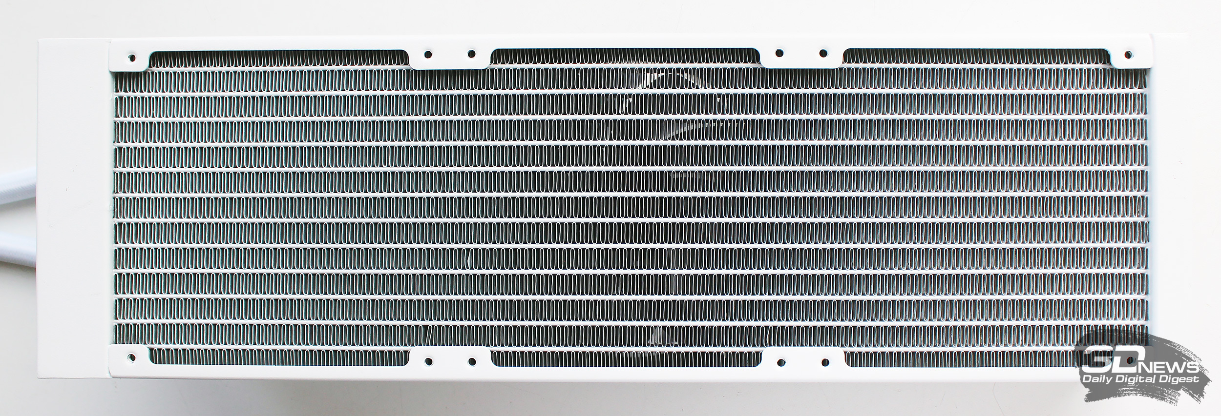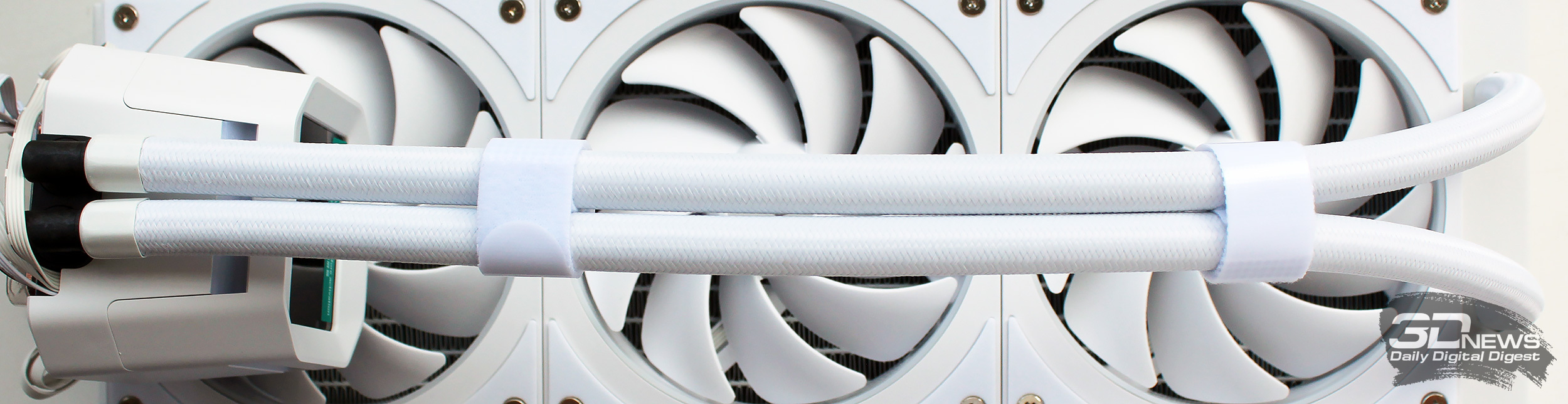 05_dcLM360_fr 06_dcLM360_frr Размеры радиатора равны 402 × 120 × 27 мм, общая масса системы составляет 1622 грамма (без учёта креплений). Алюминиевый радиатор состоит из 12 плоских каналов, между которыми приклеена перфорированная лента, собранная в гребёнку, и по которым прокачивается теплоноситель. Толщина алюминиевого оребрения в радиаторе равна 20 мм, а плотность радиатора составляет стандартные 20~21 FPI. Из увеличенного танка радиатора выходят два статичных фитинга, на которых опрессованы шланги. На противоположном торце радиатора (чуть меньшего размера) можно увидеть наклейку с указанием модели СЖО, страны производства и штрих-кодом. Также на торце радиатора выделим клапан фирменной системы защиты от протечек Anti-leak, регулирующей давление внутри контура СЖО в целях сведения к минимуму вероятности протечек. Резиновые шланги, соединяющие радиатор с помпой, облачены в нейлоновую оплётку, минимизирующую испарение теплоносителя. Их внешний диаметр не превышает 12 мм, а внутренний (предположительно) равен 6 мм. Длина шлангов от фитинга до фитинга равна 390 мм. Резюмируем, что всё вышеперечисленное в новой DeepCool LM360 WH вообще ничем не отличается от радиатора и шлангов, например, модели LQ360, протестированной нами в декабре прошлого года и используемой с тех пор в качестве эталона. То есть основа у этих систем жидкостного охлаждения одинаковая. А вот дальше будут отличия. Первое нововведение – это помпа. Она выполнена в дизайне «Звездных войн» (ну или мне так показалось) и имеет размеры 90 × 80 × 63 мм. В DeepCool заявляют, что в LM360 используется помпа шестого поколения (у LQ360 – пятого) с 3-фазным, 6-слотовым, 4-полюсным электромотором с векторной системой управления, регулирующей скорость вращения ротора в диапазоне от 2500 до 3400 об/мин. По данным мониторинга, максимальная скорость ротора помпы – 3390 об/мин, а уровень энергопотребления – 3,3 Вт. Производительность помпы в её характеристиках традиционно не указывается, а в случае с помпой LM360 не указан ещё и нормативный срок службы подшипника помпы. В крышку помпы встроен IPS-экран мониторинга диагональю 2,4 дюйма с разрешением 320×240 пикселей, работу которого мы продемонстрируем в следующем подразделе статьи. Судя по форме основания и крепежным винтам, медный водоблок в системе DeepCool LM360 WH не претерпел изменений. Он микроканальный и, скорее всего, также оснащён пластиной-ламелью для фокусировки потока жидкости в центр рёбер водоблока. Изменилось только нанесение термопасты на основание водоблока: теперь она распределена не сплошным слоем, а маленькими квадратиками. Наряду с элементарной экономией термопасты, такой подход позволил достичь более тонкого слоя термоинтерфейса при контакте с процессором и его более равномерного распределения. Отпечатки у нас получились, попросту говоря, эталонные. И это несмотря на, напомним, выпуклый теплораспределитель тестового процессора конструктивного исполнения LGA1700 (Intel Core i9-13900K). Вторым после помпы нововведением в DeepCool LM360 WH являются вентиляторы DeepCool FL12 SE. Это новая разработка китайской компании с упором на подсветке, подсветку, подсветку, встроенную не только в окружность крыльчатки, но и в периметр рамки. Сами же вентиляторы выполнены в типоразмере 120 мм, оснащены девятилопастной крыльчаткой диаметром 105 мм (уменьшен как раз из-за подсветки) и конусообразным статором диаметром 38 мм.