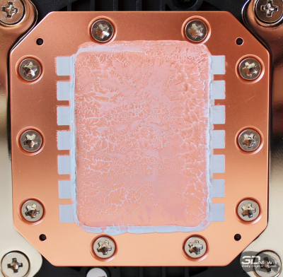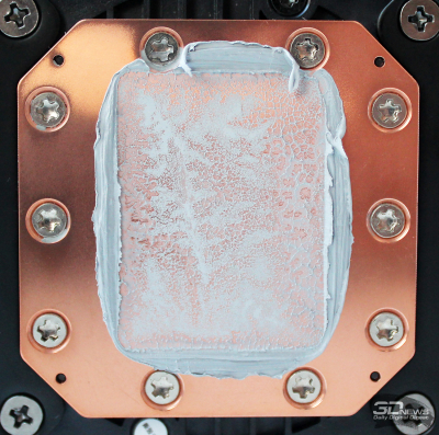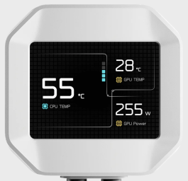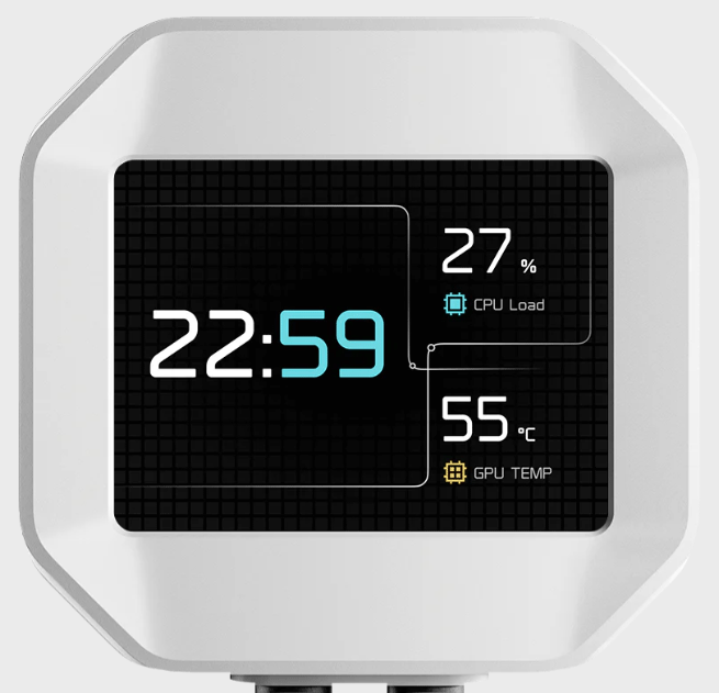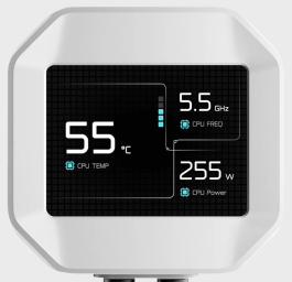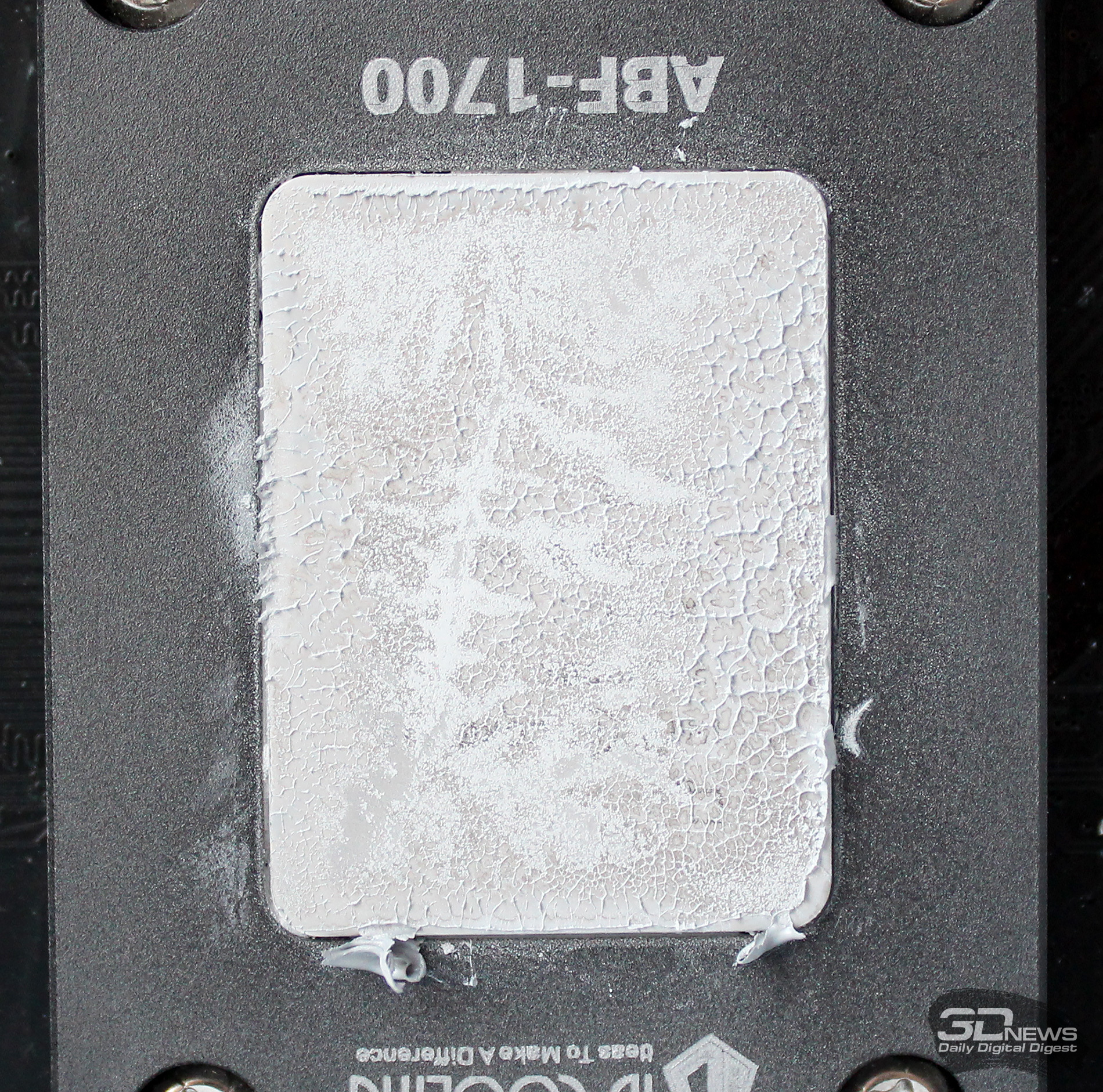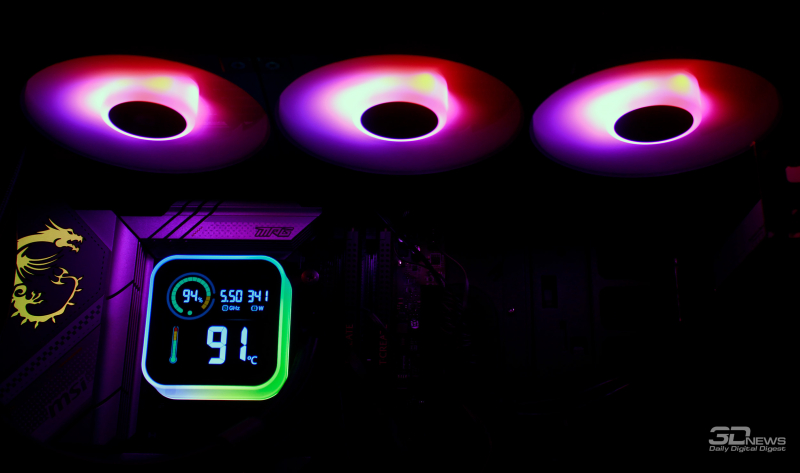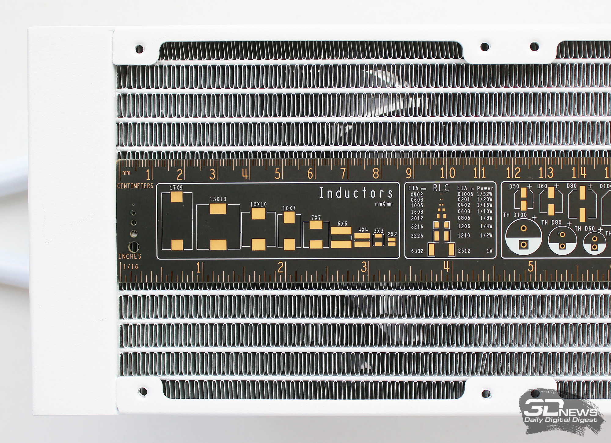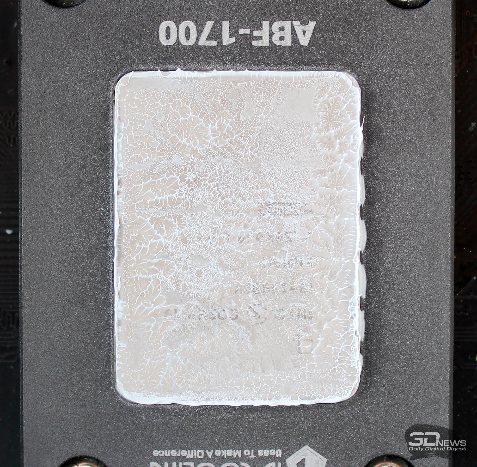05_dcLM360_fr 06_dcLM360_frr Размеры радиатора равны 402 × 120 × 27 мм, общая масса системы составляет 1622 грамма (без учёта креплений). Алюминиевый радиатор состоит из 12 плоских каналов, между которыми приклеена перфорированная лента, собранная в гребёнку, и по которым прокачивается теплоноситель. Толщина алюминиевого оребрения в радиаторе равна 20 мм, а плотность радиатора составляет стандартные 20~21 FPI. Из увеличенного танка радиатора выходят два статичных фитинга, на которых опрессованы шланги. На противоположном торце радиатора (чуть меньшего размера) можно увидеть наклейку с указанием модели СЖО, страны производства и штрих-кодом. Также на торце радиатора выделим клапан фирменной системы защиты от протечек Anti-leak, регулирующей давление внутри контура СЖО в целях сведения к минимуму вероятности протечек. Резиновые шланги, соединяющие радиатор с помпой, облачены в нейлоновую оплётку, минимизирующую испарение теплоносителя. Их внешний диаметр не превышает 12 мм, а внутренний (предположительно) равен 6 мм. Длина шлангов от фитинга до фитинга равна 390 мм. Резюмируем, что всё вышеперечисленное в новой DeepCool LM360 WH вообще ничем не отличается от радиатора и шлангов, например, модели LQ360, протестированной нами в декабре прошлого года и используемой с тех пор в качестве эталона. То есть основа у этих систем жидкостного охлаждения одинаковая. А вот дальше будут отличия. Первое нововведение – это помпа. Она выполнена в дизайне «Звездных войн» (ну или мне так показалось) и имеет размеры 90 × 80 × 63 мм. В DeepCool заявляют, что в LM360 используется помпа шестого поколения (у LQ360 – пятого) с 3-фазным, 6-слотовым, 4-полюсным электромотором с векторной системой управления, регулирующей скорость вращения ротора в диапазоне от 2500 до 3400 об/мин. По данным мониторинга, максимальная скорость ротора помпы – 3390 об/мин, а уровень энергопотребления – 3,3 Вт. Производительность помпы в её характеристиках традиционно не указывается, а в случае с помпой LM360 не указан ещё и нормативный срок службы подшипника помпы. В крышку помпы встроен IPS-экран мониторинга диагональю 2,4 дюйма с разрешением 320×240 пикселей, работу которого мы продемонстрируем в следующем подразделе статьи. Судя по форме основания и крепежным винтам, медный водоблок в системе DeepCool LM360 WH не претерпел изменений. Он микроканальный и, скорее всего, также оснащён пластиной-ламелью для фокусировки потока жидкости в центр рёбер водоблока. Изменилось только нанесение термопасты на основание водоблока: теперь она распределена не сплошным слоем, а маленькими квадратиками. Наряду с элементарной экономией термопасты, такой подход позволил достичь более тонкого слоя термоинтерфейса при контакте с процессором и его более равномерного распределения. Отпечатки у нас получились, попросту говоря, эталонные. И это несмотря на, напомним, выпуклый теплораспределитель тестового процессора конструктивного исполнения LGA1700 (Intel Core i9-13900K). Вторым после помпы нововведением в DeepCool LM360 WH являются вентиляторы DeepCool FL12 SE. Это новая разработка китайской компании с упором на подсветке, подсветку, подсветку, встроенную не только в окружность крыльчатки, но и в периметр рамки. Сами же вентиляторы выполнены в типоразмере 120 мм, оснащены девятилопастной крыльчаткой диаметром 105 мм (уменьшен как раз из-за подсветки) и конусообразным статором диаметром 38 мм.