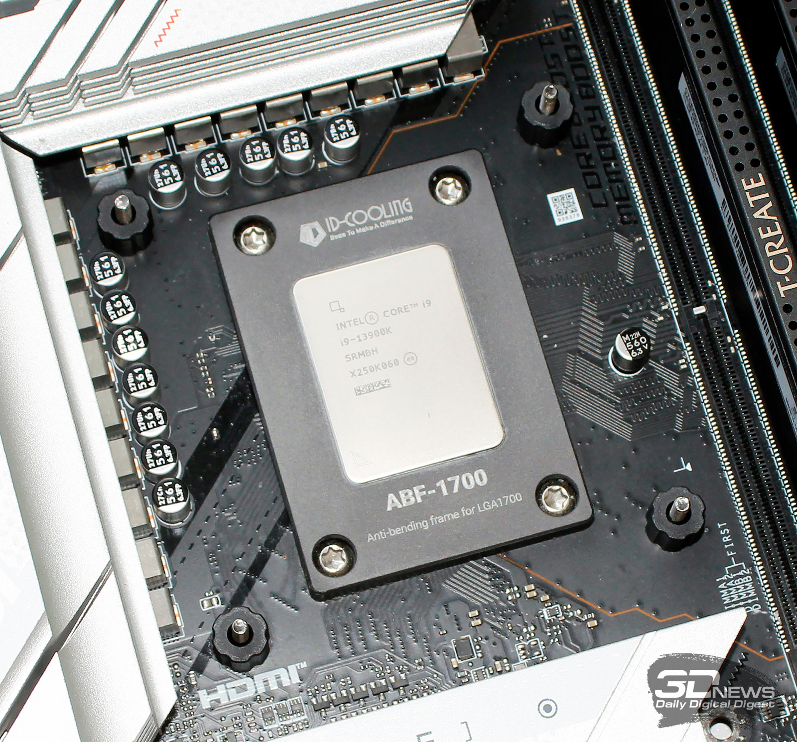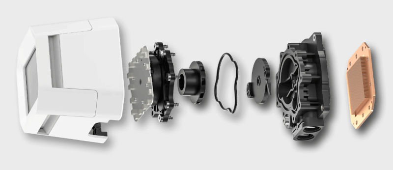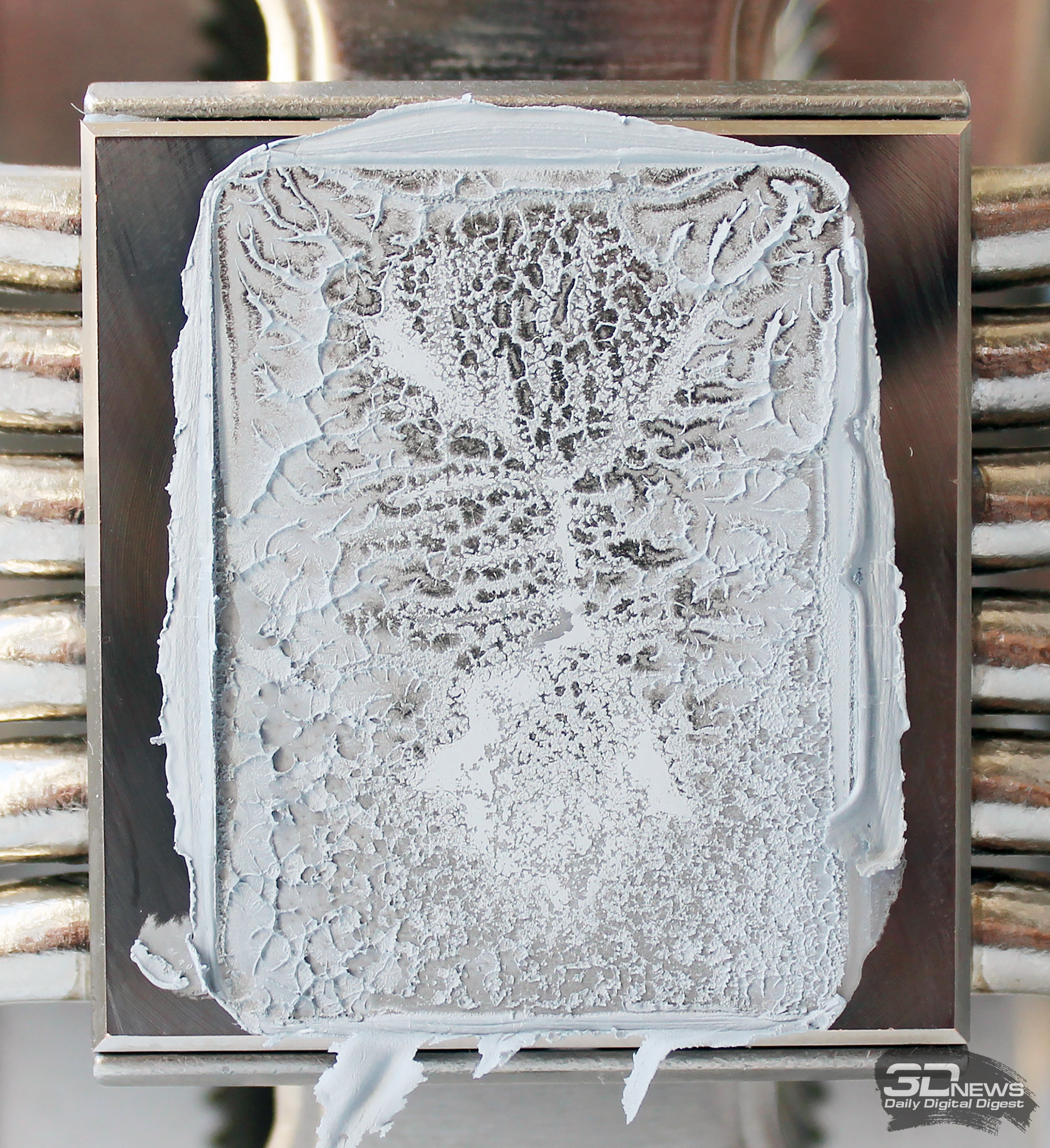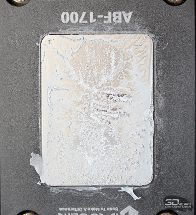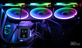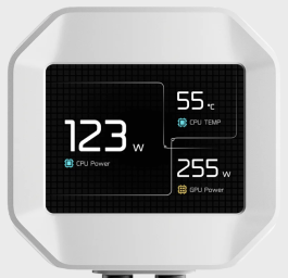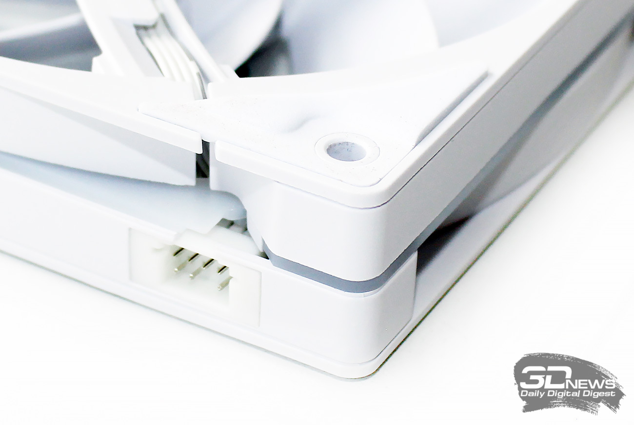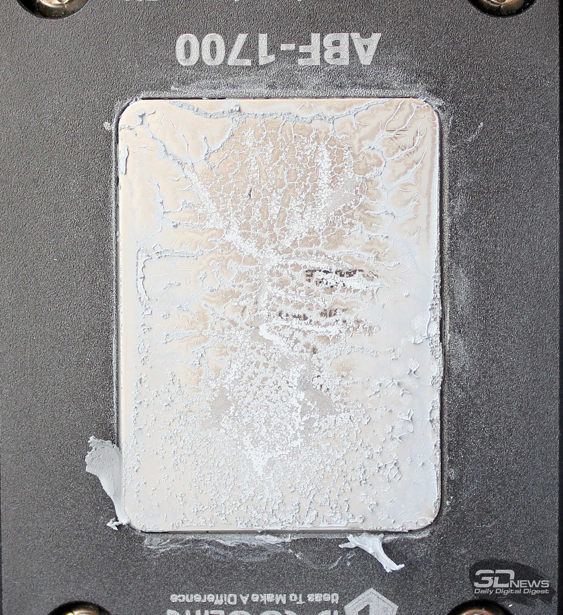 05_dcLM360_fr 06_dcLM360_frr Размеры радиатора равны 402 × 120 × 27 мм, общая масса системы составляет 1622 грамма (без учёта креплений). Алюминиевый радиатор состоит из 12 плоских каналов, между которыми приклеена перфорированная лента, собранная в гребёнку, и по которым прокачивается теплоноситель. Толщина алюминиевого оребрения в радиаторе равна 20 мм, а плотность радиатора составляет стандартные 20~21 FPI. Из увеличенного танка радиатора выходят два статичных фитинга, на которых опрессованы шланги. На противоположном торце радиатора (чуть меньшего размера) можно увидеть наклейку с указанием модели СЖО, страны производства и штрих-кодом. Также на торце радиатора выделим клапан фирменной системы защиты от протечек Anti-leak, регулирующей давление внутри контура СЖО в целях сведения к минимуму вероятности протечек. Резиновые шланги, соединяющие радиатор с помпой, облачены в нейлоновую оплётку, минимизирующую испарение теплоносителя. Их внешний диаметр не превышает 12 мм, а внутренний (предположительно) равен 6 мм. Длина шлангов от фитинга до фитинга равна 390 мм. Резюмируем, что всё вышеперечисленное в новой DeepCool LM360 WH вообще ничем не отличается от радиатора и шлангов, например, модели LQ360, протестированной нами в декабре прошлого года и используемой с тех пор в качестве эталона. То есть основа у этих систем жидкостного охлаждения одинаковая. А вот дальше будут отличия. Первое нововведение – это помпа. Она выполнена в дизайне «Звездных войн» (ну или мне так показалось) и имеет размеры 90 × 80 × 63 мм. В DeepCool заявляют, что в LM360 используется помпа шестого поколения (у LQ360 – пятого) с 3-фазным, 6-слотовым, 4-полюсным электромотором с векторной системой управления, регулирующей скорость вращения ротора в диапазоне от 2500 до 3400 об/мин. По данным мониторинга, максимальная скорость ротора помпы – 3390 об/мин, а уровень энергопотребления – 3,3 Вт. Производительность помпы в её характеристиках традиционно не указывается, а в случае с помпой LM360 не указан ещё и нормативный срок службы подшипника помпы. В крышку помпы встроен IPS-экран мониторинга диагональю 2,4 дюйма с разрешением 320×240 пикселей, работу которого мы продемонстрируем в следующем подразделе статьи. Судя по форме основания и крепежным винтам, медный водоблок в системе DeepCool LM360 WH не претерпел изменений. Он микроканальный и, скорее всего, также оснащён пластиной-ламелью для фокусировки потока жидкости в центр рёбер водоблока. Изменилось только нанесение термопасты на основание водоблока: теперь она распределена не сплошным слоем, а маленькими квадратиками. Наряду с элементарной экономией термопасты, такой подход позволил достичь более тонкого слоя термоинтерфейса при контакте с процессором и его более равномерного распределения. Отпечатки у нас получились, попросту говоря, эталонные. И это несмотря на, напомним, выпуклый теплораспределитель тестового процессора конструктивного исполнения LGA1700 (Intel Core i9-13900K). Вторым после помпы нововведением в DeepCool LM360 WH являются вентиляторы DeepCool FL12 SE. Это новая разработка китайской компании с упором на подсветке, подсветку, подсветку, встроенную не только в окружность крыльчатки, но и в периметр рамки. Сами же вентиляторы выполнены в типоразмере 120 мм, оснащены девятилопастной крыльчаткой диаметром 105 мм (уменьшен как раз из-за подсветки) и конусообразным статором диаметром 38 мм.