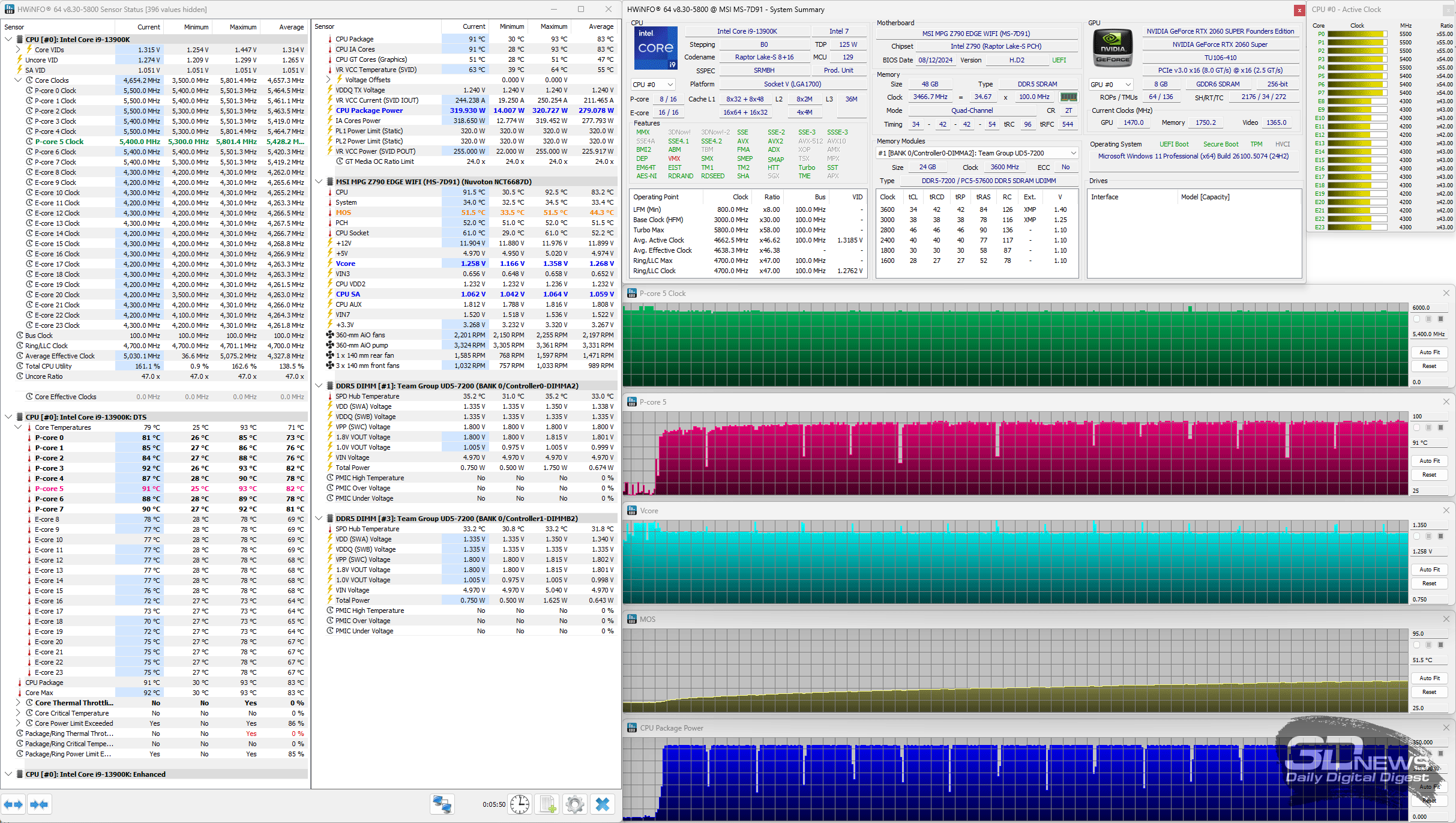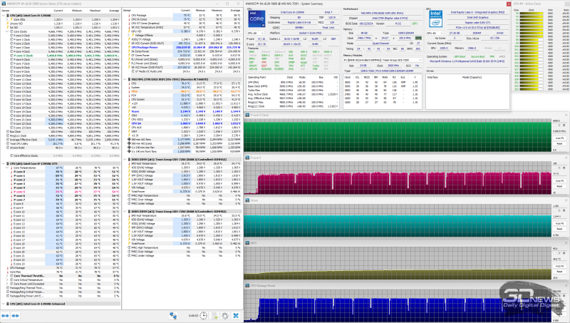 Для получения стабильных и объективно сопоставимых друг с другом результатов основные параметры процессора были зафиксированы в следующих значениях: частота BCLK – 100 МГц, множитель производительных ядер – 54, частота – 5,4 ГГц, множитель энергоэффективных ядер – 43, частота – 4,3 ГГц, напряжение Vcore – 1,145-1,15 В. В BIOS материнской платы MSI был выставлен третий уровень стабилизации напряжения на ядре процессора (CPU load-line calibration). По данным HWiNFO64, уровень тепловыделения процессора с такими настройками достигал 260 ватт (реальное немного ниже). Эффективная частота оперативной памяти была зафиксирована на отметке 6,933 ГГц при напряжениях 1,305/1,295 В (VDD/VDDQ), а её основные тайминги фиксировались в значениях 34-42-42-54 CR2 с дополнительной подстройкой вторичных и третичных таймингов. Напряжение VCCSA фиксировалось на уровне 1,055 В. Частота кольцевой шины (ring) была установлена на отметке 4,8 ГГц. Тестирование было проведено в операционной системе Microsoft Windows 11 Pro версии 24H2 (26100.5074). Программное обеспечение, использованное для теста:
