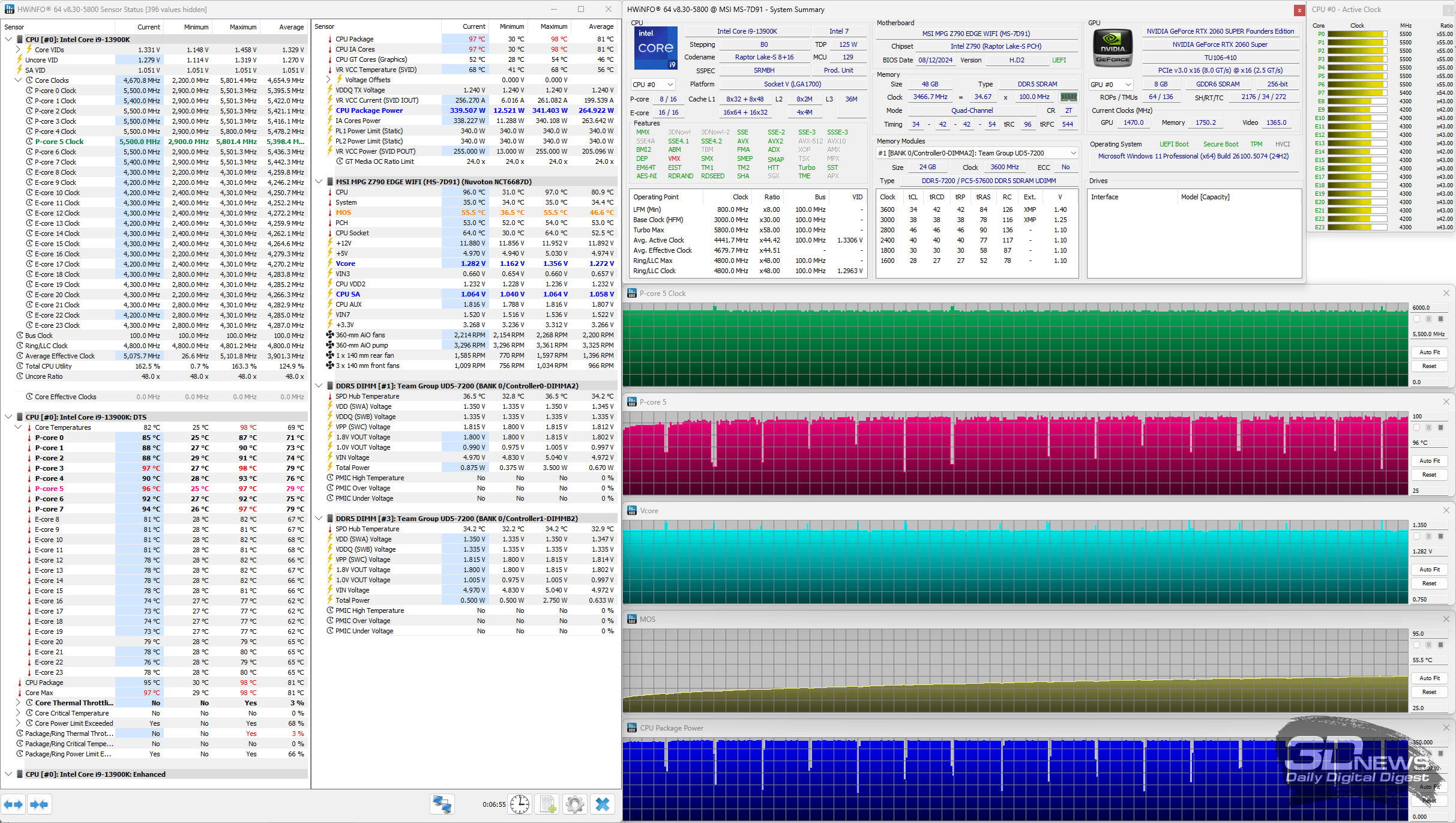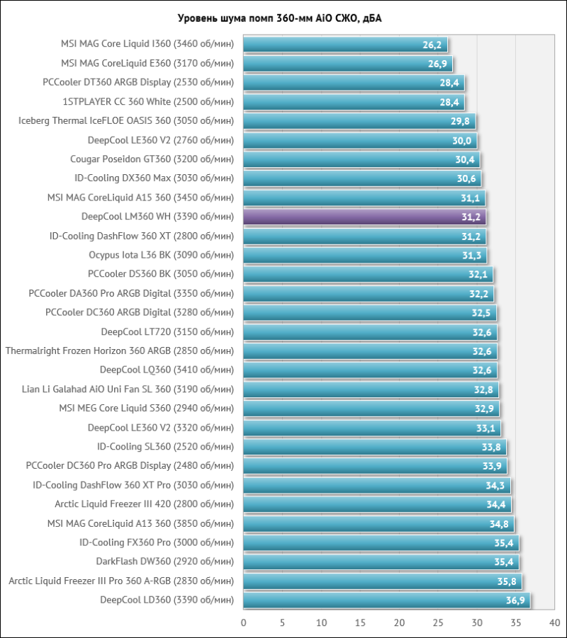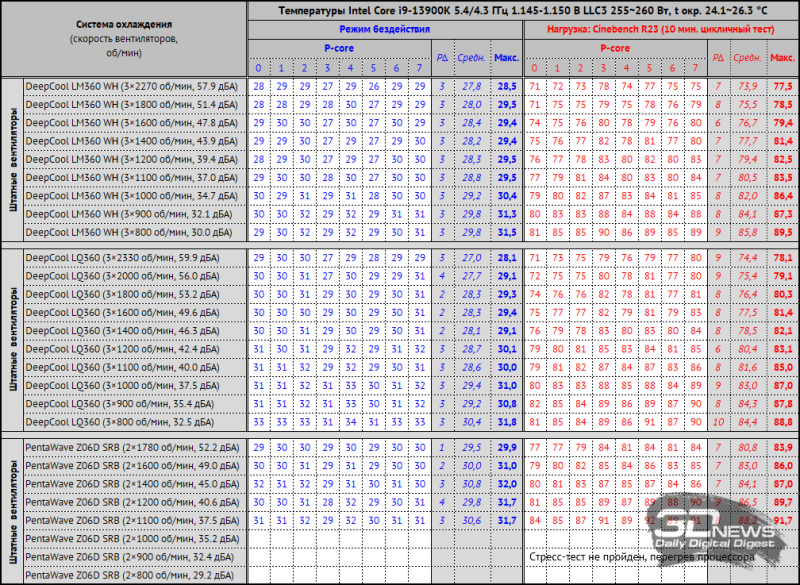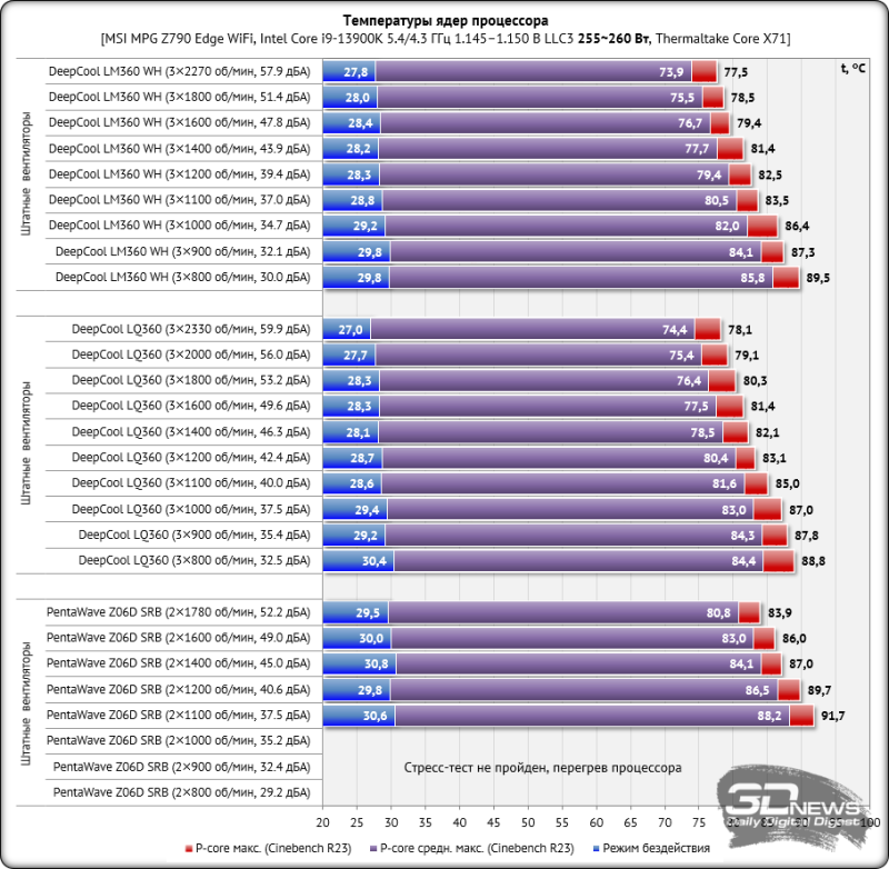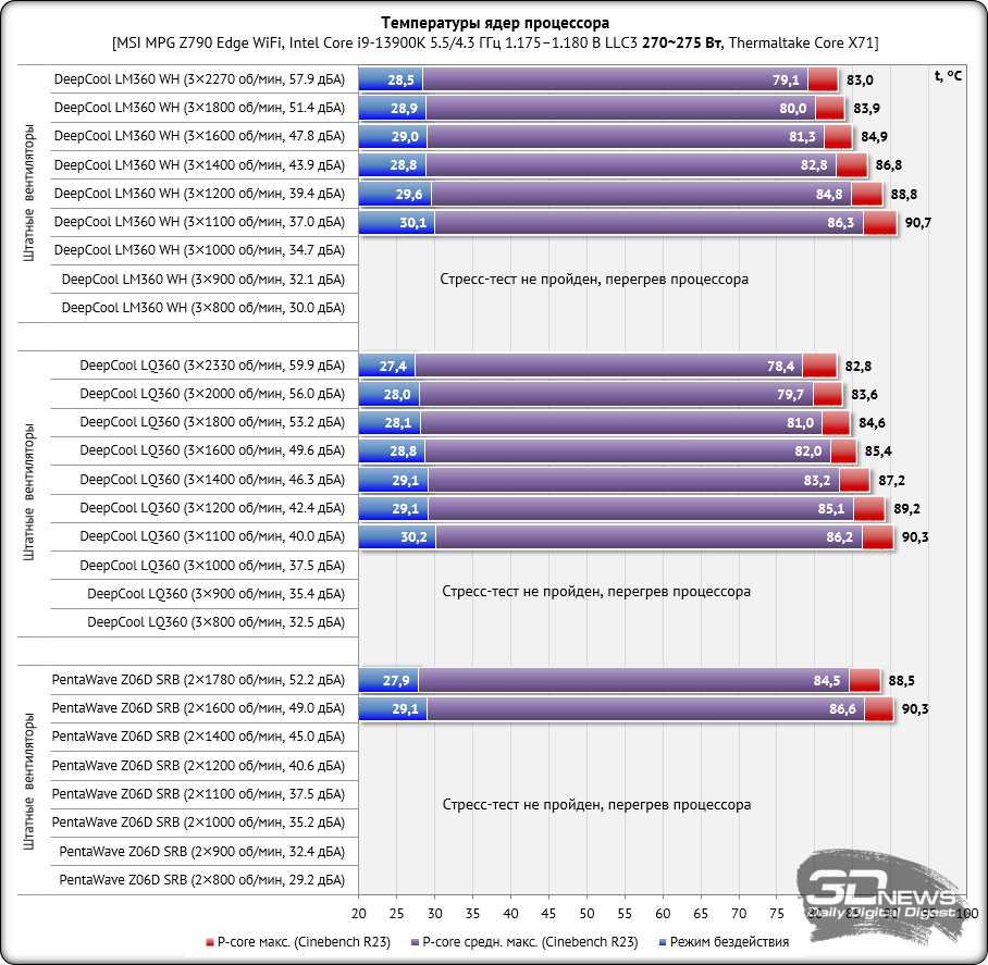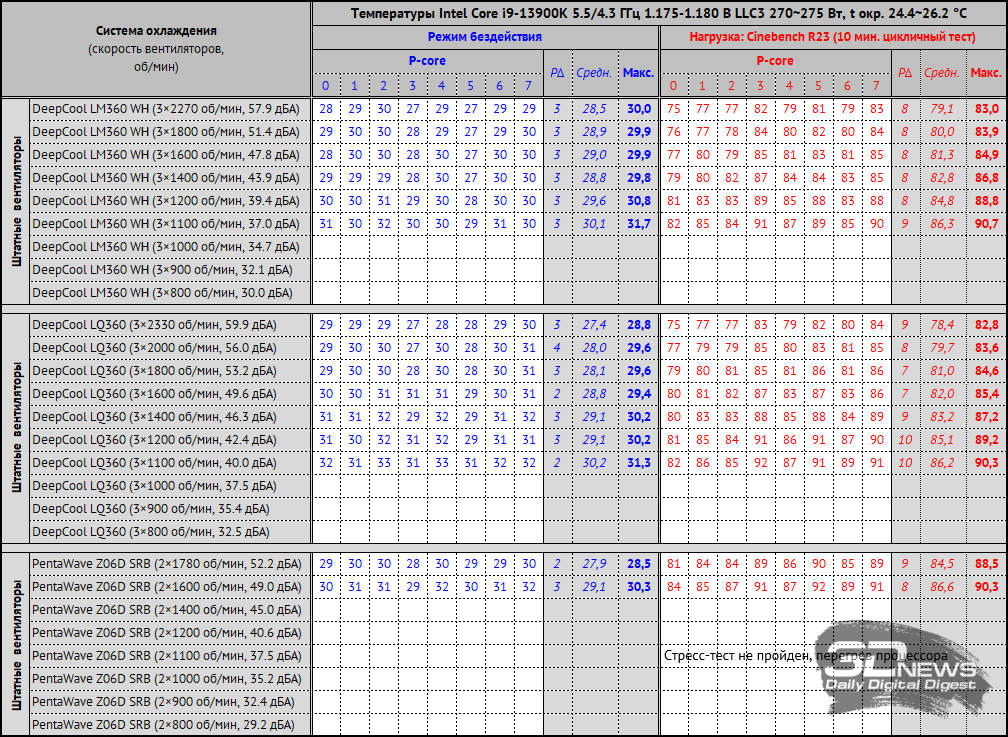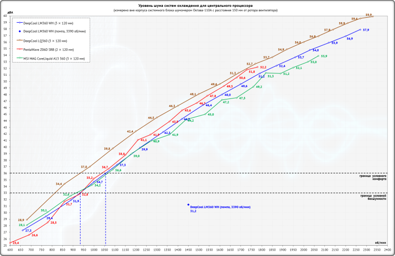 Снимок экрана мониторинга во время одного из циклов тестирования выглядит следующим образом. Нагрузка на процессор создавалась двумя последовательными циклами Cinebench R23. На стабилизацию температуры CPU между циклами отводилось по 10 минут. За окончательный результат, который вы увидите на диаграмме, принята максимальная температура наиболее горячего из восьми производительных ядер центрального процессора в пике нагрузки и в режиме простоя, а также средняя максимальная температура по всем таким ядрам. Кроме этого, в отдельной таблице будут приведены температуры всех производительных ядер процессора, их усреднённые значения и дельта температур между ядрами. Температура в помещении контролировалась установленным рядом с системным блоком электронным термометром с точностью измерений 0,1 °C и с возможностью почасового мониторинга изменения температуры в помещении за последние 6 часов. Во время данного тестирования температура колебалась в диапазоне 24,1–26,3 °C (дельта учитывалась в результатах). Измерение уровня шума систем охлаждения проводилось электронным шумомером «ОКТАВА-110А» в период от ноля до трёх часов ночи в полностью закрытой комнате площадью около 20 м2. Уровень шума измерялся вне корпуса системного блока, когда источником шума в помещении являлась только система охлаждения и её вентиляторы. Шумомер, зафиксированный на штативе, всегда располагался строго в одной точке на расстоянии ровно 150 мм от ротора вентилятора. Системы охлаждения размещались на самом углу стола на подложке из вспененного полиэтилена. Нижняя граница измерений шумомера составляет 22 дБА, а субъективно-комфортный (просьба не путать с низким!) уровень шума систем охлаждения при измерениях с такого расстояния находится около отметки 36 дБА. За условно-низкий уровень шума мы принимаем значение 33 дБА. Основным соперником DeepCool LM360 WH выступит уже не раз упомянутая сегодня система с 360-мм радиатором DeepCool LQ360. Кроме этого, в тестирование включен воздушный суперкулер PentaWave Z06D SRB. Добавим, что скорость вращения крыльчаток вентиляторов тестируемых систем охлаждения регулировалась в диапазоне от 800 об/мин до их максимума с шагом 100 или 200 об/мин с помощью специального контроллера, точность которого составляет ±10 об/мин. ⇡#Результаты тестов и их анализ⇡#Эффективность охлажденияОбе системы жидкостного охлаждения DeepCool показали практически одинаковые результаты. Максимальная разница достигает двух градусов Цельсия в пользу LM360 WH на скорости вентиляторов 1600 об/мин, а также на 1800 об/мин, где разница составляет 1,8 градуса Цельсия в пользу новинки. Однако в более актуальных режимах эксплуатации СЖО, когда скорости вентиляторов находятся в диапазоне от 800 до 1200 об/мин, разница в эффективности лежит в пределах 0,7 градуса Цельсия в ту или иную сторону. С уверенностью можно сказать, что в этом тестовом режиме эффективность LM360 и LQ360 одинакова. Что касается их преимущества перед PentaWave Z06D SRB, то оно достигает 6,7 градуса Цельсия на 1100 об/мин, а при более низкой скорости вентиляторов воздушный кулер уже не справляется с нагрузкой. Далее традиционно повышаем частоту производительных ядер процессора до 5,5 ГГц при напряжении 1,175-1,18 В. Уровень LLC тот же, энергоэффективные ядра не трогаем, а частоту кольцевой шины оставляем на отметке 4,8 ГГц. По данным HWiNFO64 тепловыделение процесс