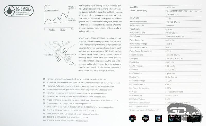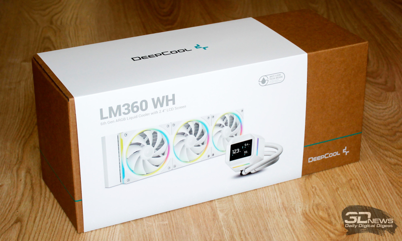 Мы – да, думаем, и вы тоже – уже, уже совсем перестали удивляться тому потоку систем жидкостного охлаждения необслуживаемого типа (AiO СЖО), который сейчас буквально «затапливает» российский рынок. В последнее время, анонсируемые по нескольку штук в неделю, они соревнуются друг с другом в подсветке вентиляторов и экранах на помпе, поскольку все другие ресурсы для дальнейшего развития у них, похоже, исчерпаны. Вот и в новой модели DeepCool LM360 именитая компания акцентирует внимание на усовершенствованном экране мониторинга, но одновременно с этим оснастила свою СЖО модернизированной помпой и новыми вентиляторами с интересной формой крыльчатки и маленьким статором. Кроме этого, есть ещё пара небольших изменений, призванных сделать систему удобнее в эксплуатации и эффективнее. Обо всём этом мы расскажем вам в сегодняшнем материале. ⇡#Обзор AiO СЖО DeepCool LM360 WH⇡#Технические характеристики и стоимость