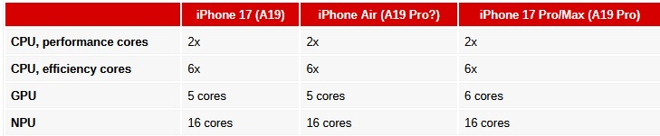 Флагманский процессор. В рамках презентации было объявлено, что iPhone Air получил флагманский чип Apple A19 Pro. Так ли это на самом деле? Apple традиционно скупа на подробности о чипах A-серии. Всё, что известно об их характеристиках, указано в таблице ниже.