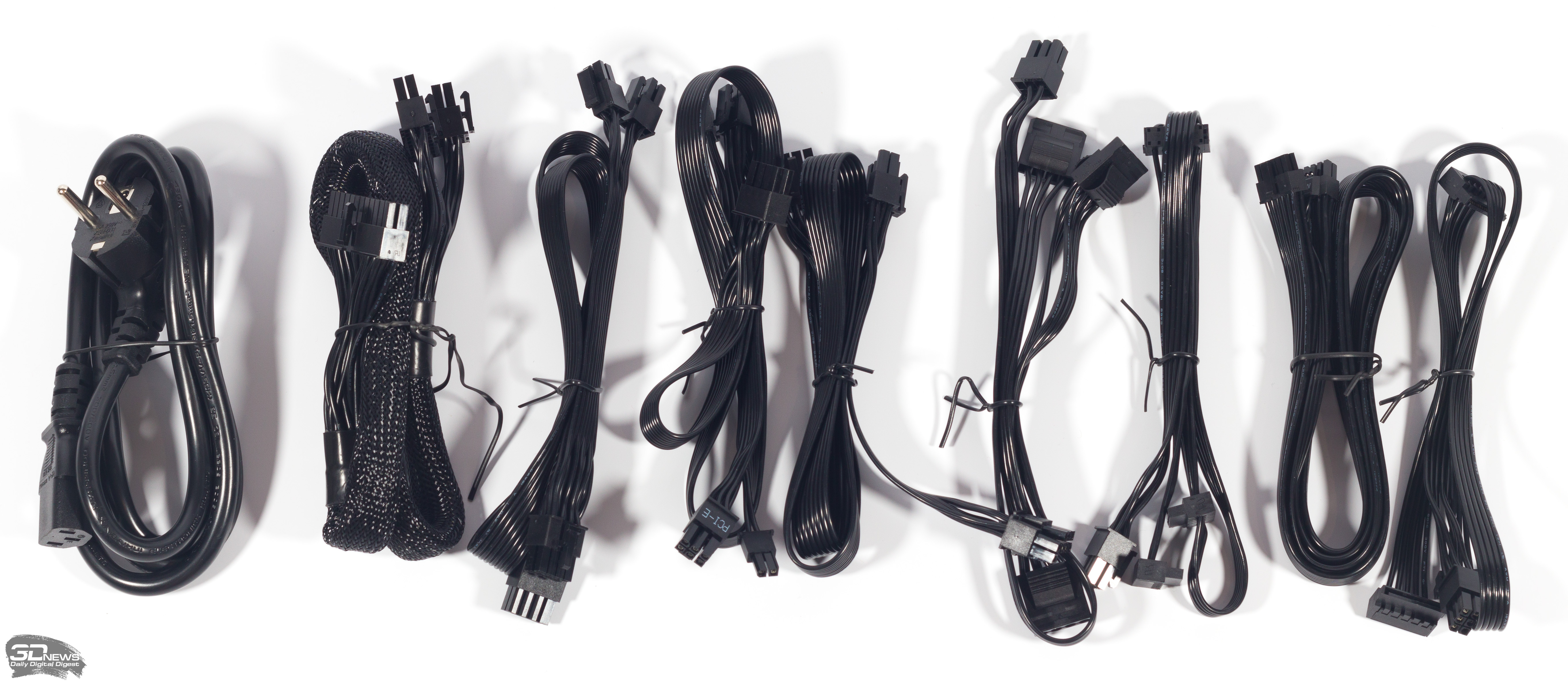 В отличие от моделей серии Vega без пометки M, устройство комплектуется съемными кабелями. Не считая 12V-2x6, для 12-вольтовых кабелей предусмотрены лишь три разъема. При этом у кабелей питания CPU и плат PCI Express старого образца разная форма контактной колодки.