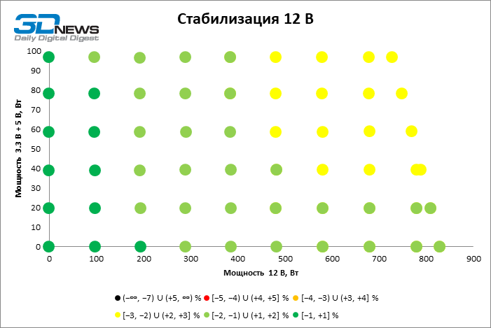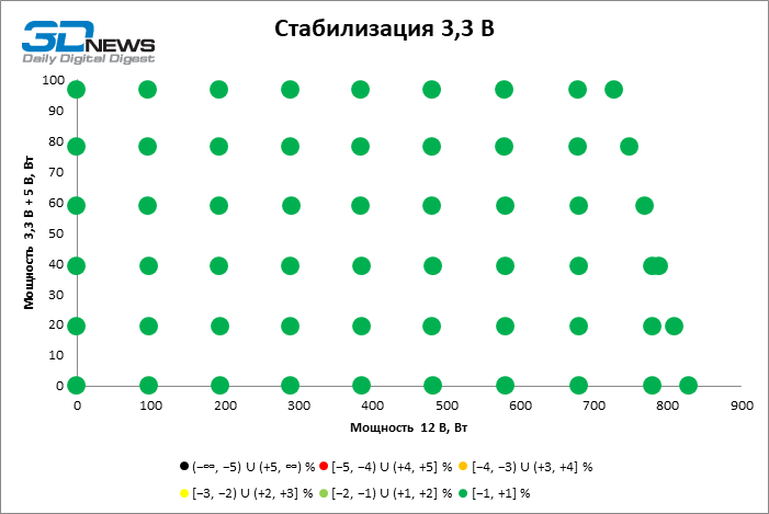 Напряжение линии 12 В отклоняется от номинала не более чем на 3 %, а линия 3,3 В стабилизирована безупречно. Серия кросс-нагрузочных тестов при равным токе малых линий не выявила проблем и с линией 5 В, однако под нагрузкой в 100 Вт это напряжение балансирует на грани недопустимого.