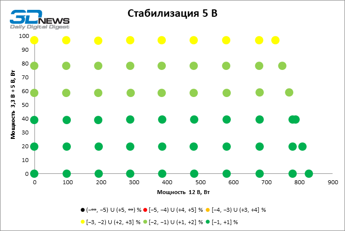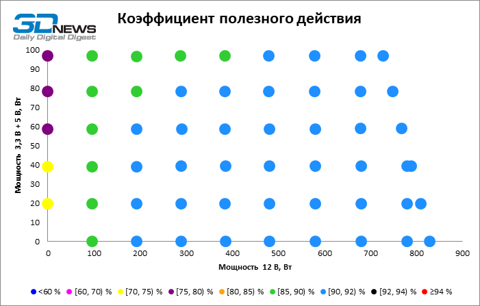 Напряжение 5VSB В отклоняется от эталонной величины не более чем на 2 %. Кроме того, линия дежурного питания обладает впечатляющим КПД в 80–81 %.