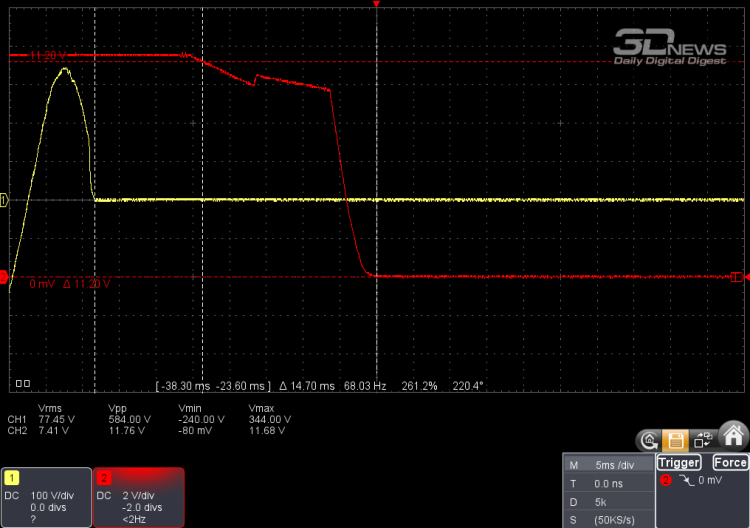 Время корректной регуляции напряжения 12 В после обрыва питания под максимальной нагрузкой составляет 14,7 мс. Таким образом, PPG-850-C соответствует требуемой величине от 12 мс, но не достиг рекомендованных 17 мс.