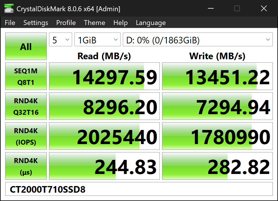 При последовательном чтении и записи Crucial T710 выдаёт очень высокий результат, близкий к пределу пропускной способности шины PCIe 5.0. Его обеспечивает новая 276-слойная TLC 3D NAND компании Micron, однако справедливости ради нужно заметить, что WD Black SN8100 с BiCS8-памятью, выпущенной SanDisk, всё-таки чуть быстрее.