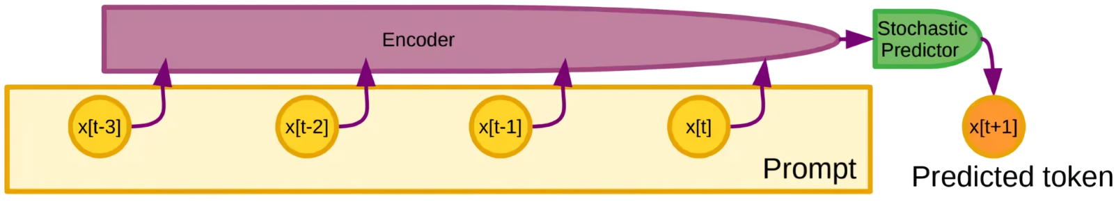 Блок-схема реализации авторегрессионного подхода для БЯМ: кодировщик переводит предыдущие фрагменты ввода в токены (не обязательно отдельные слова; это могут быть и фразы прежних диалогов оператора с машиной, и целые страницы текста — всё зависит от ширины контекстного окна), затем в блоке стохастического предиктора производится, по сути, взвешенное суммирование, и на выходе получается очередной предсказанный токен (источник: New York University)