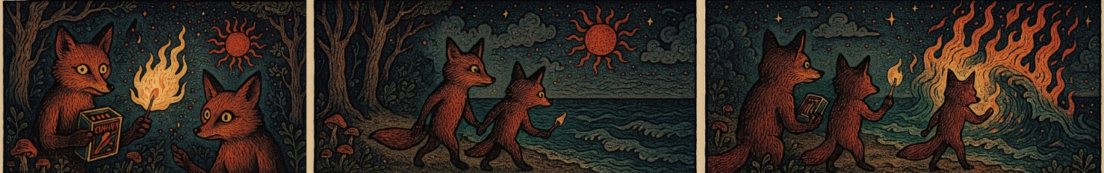 «Нарисуй комикс на три панели о том, как лисички взяли спички, к морю синему пошли, море синее зажгли». — «Ни слова больше! Уже рисую!» (источник: ИИ-генерация на основе модели GPT-image-1)
