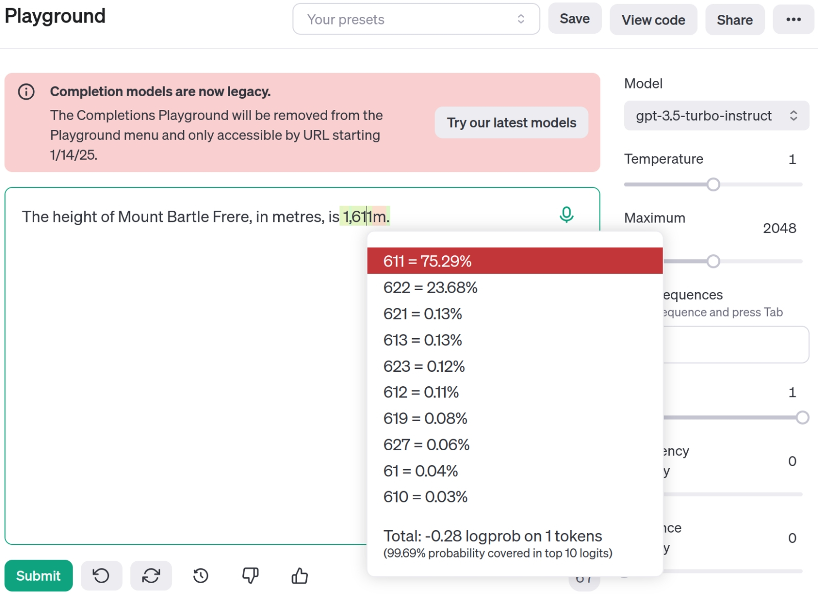 На платформе OpenAI в период выпуска свежих моделей открывают для разработчиков «игровую площадку» (playground), где можно вволю тестировать новинки. Здесь представлены результаты длинной серии испытаний, проведённых Анджем Симмонсом (Anj Simmons), который обнаружил, что высота некой австралийской горы указывается GPT-3.5 то так, то эдак — и ответственно подошёл к вопросу (источник: OpenAI)