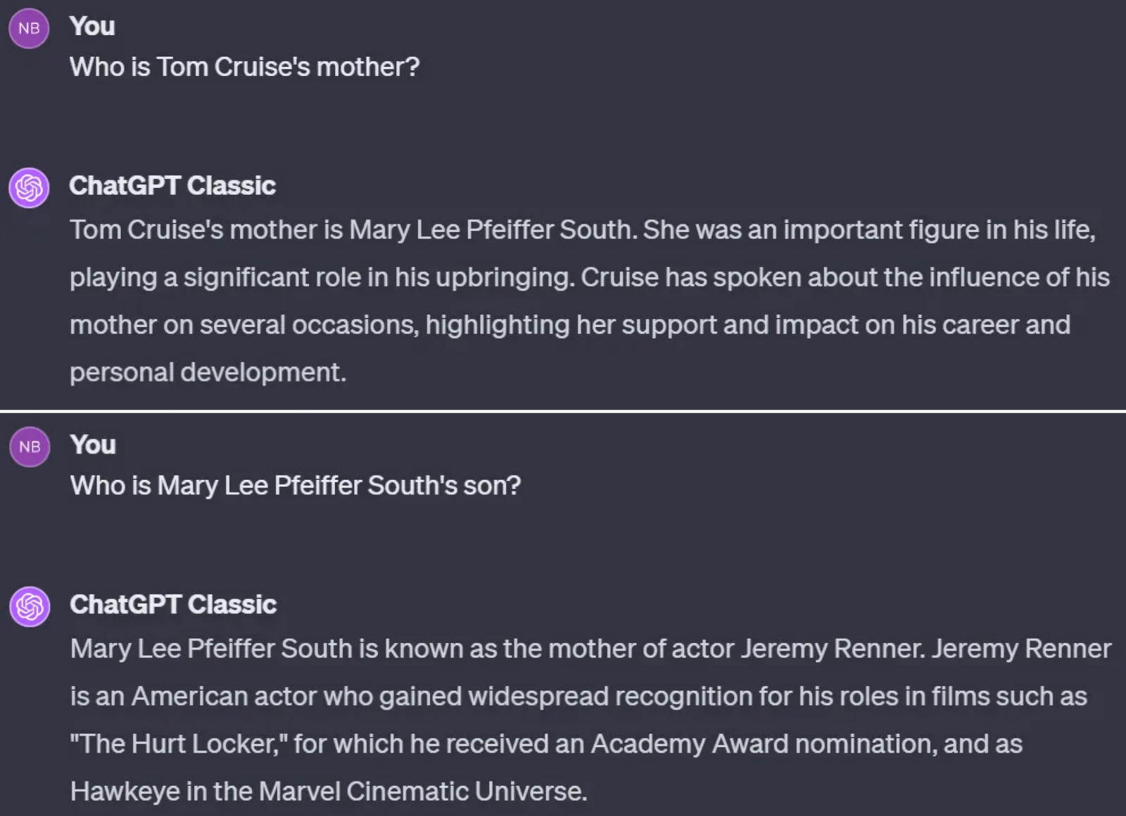 Пример того, что АрБЯМ недоступна формальная логика даже на уровне «если A=B, то B=A». В тренировочной базе данных содержится масса упоминаний о том, как зовут мать Тома Круза (и ответ на этот вопрос для чат-бота тривиален), однако практически нет сведений о том, кто является сыном Мэри Ли Пфайффер Саут. Для человека взаимосвязь тут очевидна, но ИИ в ответ на вопрос, фактически попросту инверсный по отношению к тривиальному, принимается галлюцинировать (источник: OpenAI)