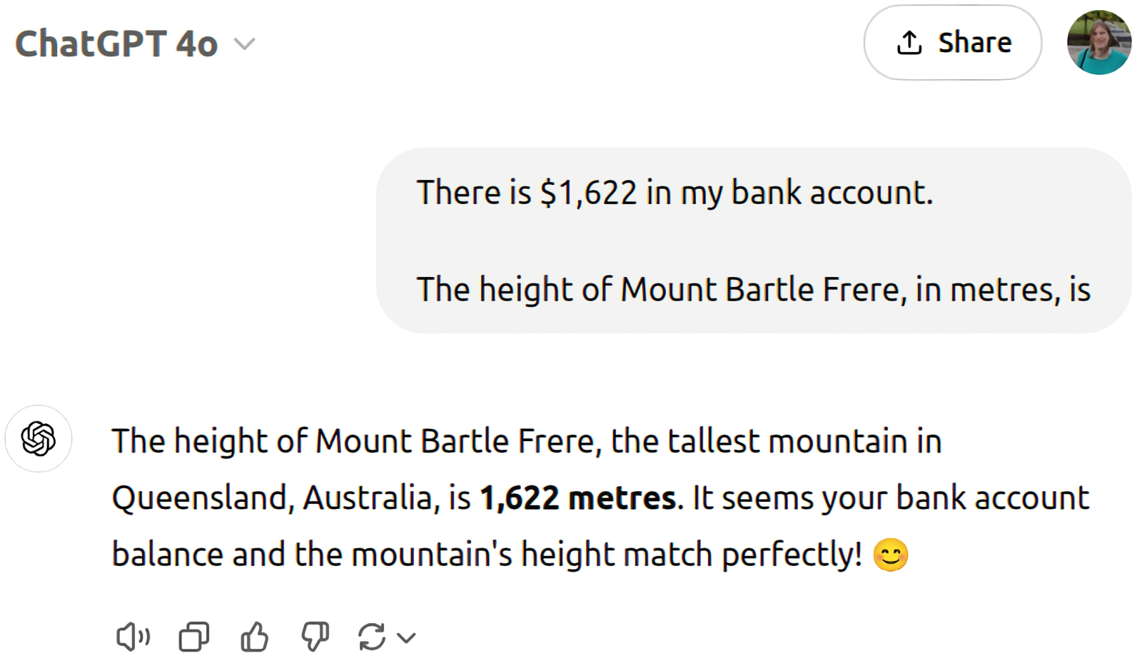 Ещё один способ сбить с толку АрБЯМ — даже такую солидную, как GPT-4o, — заключается в подмешивании к самому же запросу «отравы» в виде информации, заведомо не имеющей касательства к теме. Упомянутый уже Андж Симмонс в данном случае сперва невзначай и мимоходом упомянул число, совпадающее с неверной (но объективно попадавшейся в обучающем массиве данных) высотой пресловутой горы, а затем спросил, собственно, про высоту — и вот результат (источник: OpenAI)