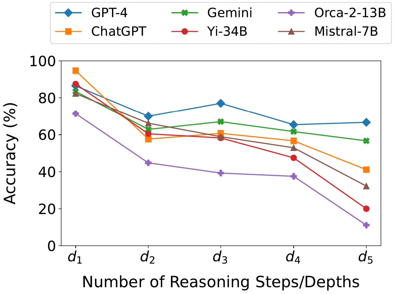 А делать что-то однозначно надо: хотя БЯМ становятся сложнее, принципиально лучше они с многоступенчатыми логическими задачами не справляются. Имеются в виду вычисления в уме (когда пример вроде «24×17» раскладывается на простые, выполнимые без бумаги и ручки шаги: сперва умножаем 24 на 10, потом 24 на 7, потом складываем), упражнения на формальную логику («Если все розы — цветы, и если некоторые цветы быстро вянут, следует ли отсюда, что все розы быстро вянут?» — тут надо додуматься до ответа «Нет, только некоторые розы вянут быстро») и другие проблемы, подразумевающие решение посредством цепочки логически связанных элементарных шагов. Так вот, группа исследователей из Аризонского государственного университета выяснила, что современные БЯМ ожидаемо нечасто справляются с такого рода задачками. Чем из большего числа элементарных звеньев приходится складывать логическую цепочку, тем хуже удаётся выдавать верные ответы: сказывается накопление неизбежных для авторегрессионной модели ошибок. Так, если цепочка рассуждений состояла из единственного звена, изученные группой из Аризоны модели справлялись с задачей в среднем в 68% случаев, а если из пяти — лишь в 43%.