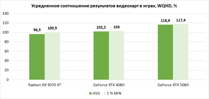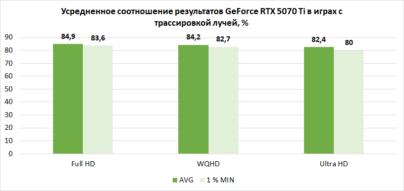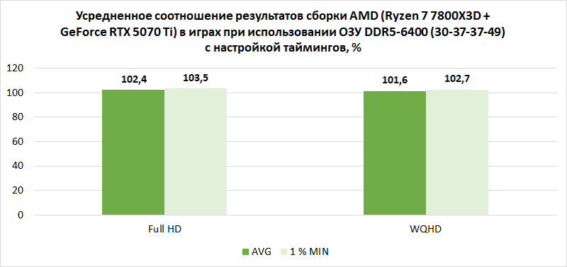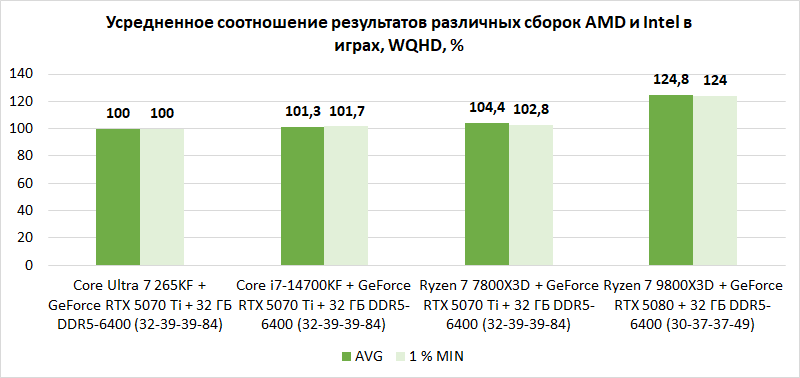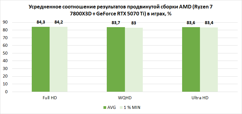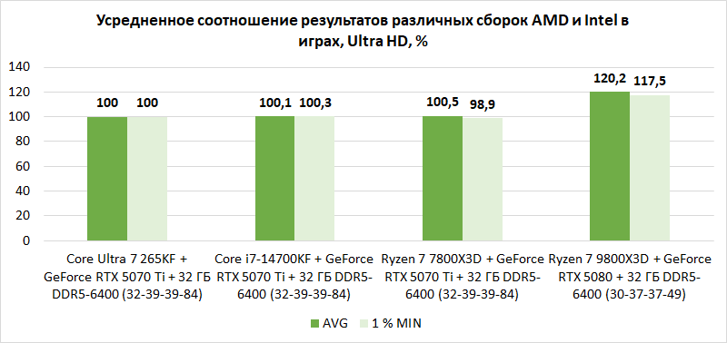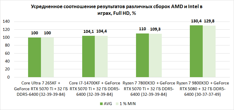 *За 100 % приняты результаты сборки c Ryzen 7 7800X3D, GeForce RTX 5070 Ti и памятью DDR5-6400 (32-39-39-84)