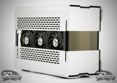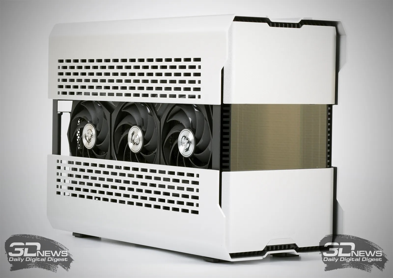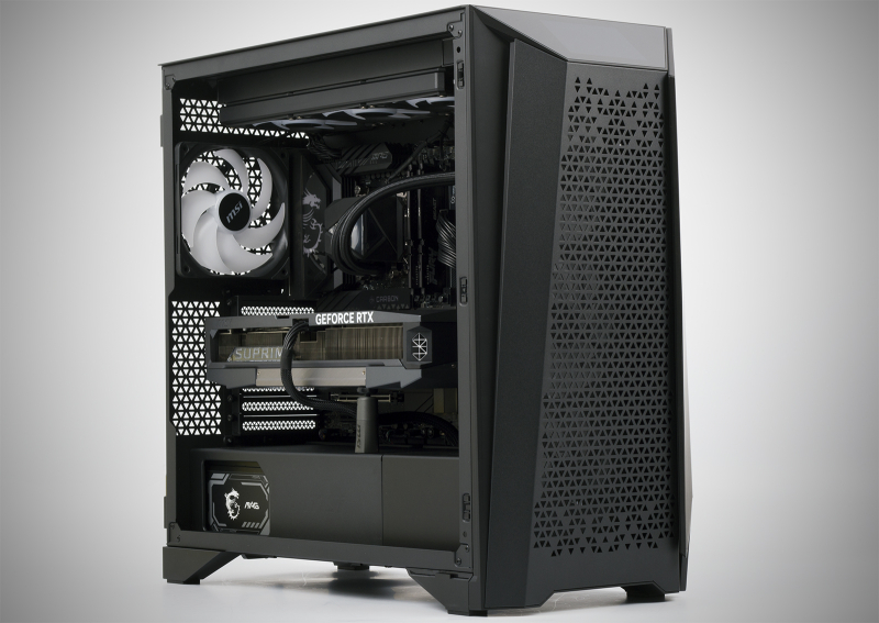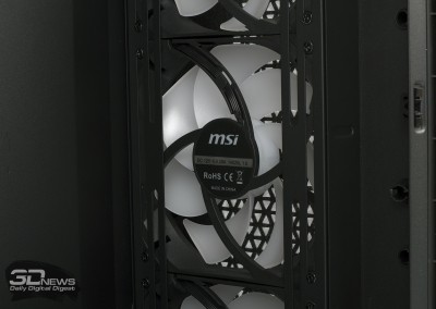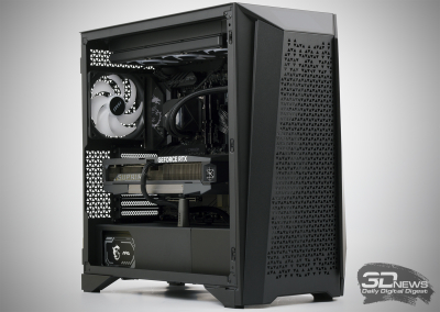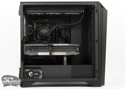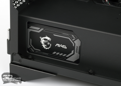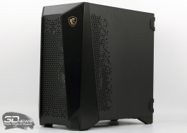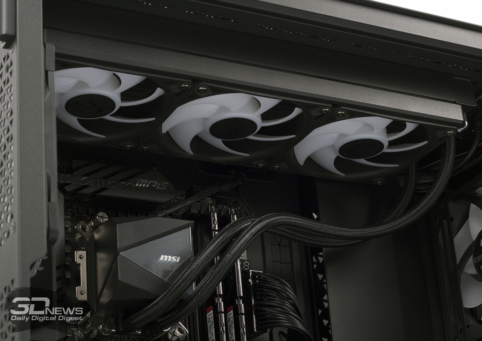 Пожалуй, большущим тортом под вишенкой в этой конфигурации является Full-Tower-корпус MSI MEG PROSPECT 700R. Устройство — наивместительнейшее, оно поддерживает установку материнских плат форм-фактора E-ATX, видеокарт длиной до 400 мм, процессорных кулеров высотой до 185 мм и блоков питания глубиной до 220 мм. При этом на передней, верхней и боковой панелях поместятся 360-мм радиаторы СЖО или до девяти вентиляторов диаметром до 140 мм. В комплекте с MEG PROSPECT 700R уже идут четыре 140-мм крыльчатки, оснащенные RGB-подсветкой. Корпус хорошо продувается и явно рассчитан на использование горячего железа. Все посадочные места здесь (сверху, спереди, снизу и сбоку) оснащены пылевыми фильтрами. Видеокарту можно установить в вертикальном положении — стойка идет в комплекте, но гибкий райзер придется докупить отдельно. А еще в комплекте с «Проспектом» идут несколько монтажных боковых панелей, то есть шасси устройства адаптируется в зависимости от того, какое железо и сколько вентиляторов вы используете.