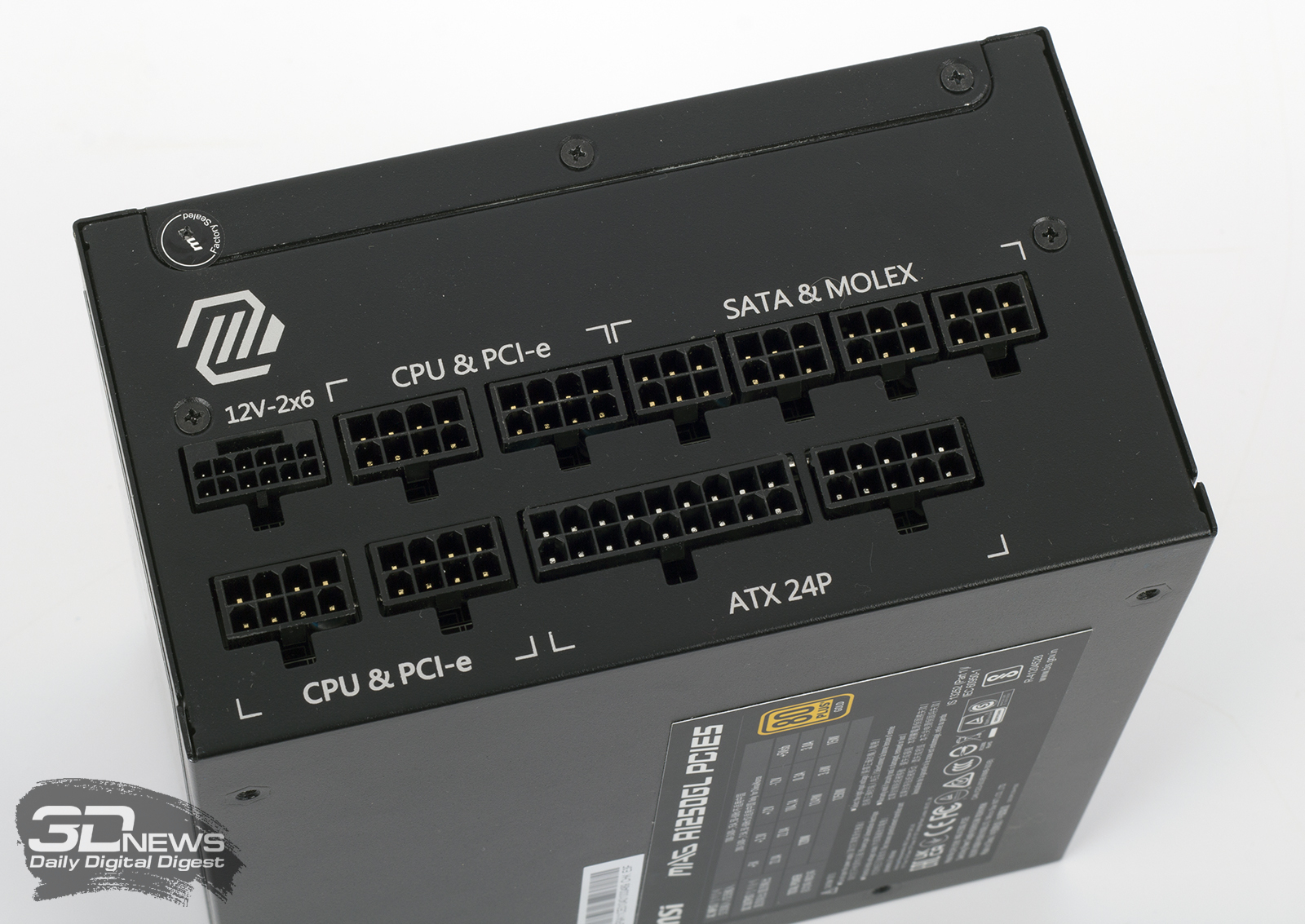 В сентябре в «Компьютере месяца» в качестве примера в продвинутой сборке была указана модель MSI MAG A1000GL PCIE5 на 1000 Вт. Для тестов мне предоставили версию чуть мощнее — MAG A1250GL PCIE5 на 1250 Вт. Оба устройства обладают честными ваттами — это значит, что вся заявленная мощность передается по 12-вольтовой линии. Оба блока питания соответствуют энергетическому сертификату 80 PLUS Gold. Устройства оснащены полноценным разъемом 12V-2x6, передающим до 600 Вт электроэнергии. Пластиковый коннектор окрашен в желтый цвет — таким образом, производитель снижает вероятность неправильного подключения разъема к видеокарте. Кабель-менеджмент здесь — полностью модульный. MAG A1250GL PCIE5 без проблем запитает и самые мощные видеокарты AMD, оснащенные до четырех разъемов PCI-E 6+2. За охлаждение компонентной базы отвечает 135-мм вентилятор с долговечным гидродинамическим подшипником.