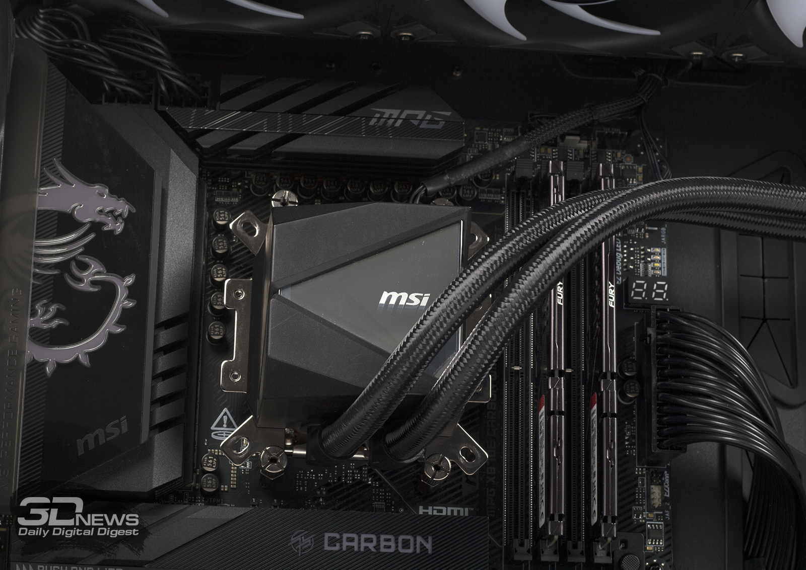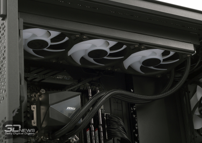 В частности, в продвинутой сборке «Компьютера месяца» я нередко рекомендую разнообразные модели необслуживаемых СЖО с трехсекционным радиатором. В стенде использовалась MSI MAG CORELIQUID I360 — эта «водянка» доступна как в черном, таки и в белом цвете. Установка и крепление устройства — элементарнейшее за счет применения универсальной системы UNI Bracket. Поддерживаются все современные массовые платформы. Радиатор СЖО оснащен специальной крышкой, скрывающей провода установленных вентиляторов. Сами крыльчатки оснащены RGB-подсветкой — как и кожух водоблока. В сборе система выглядит стильно и опрятно.
