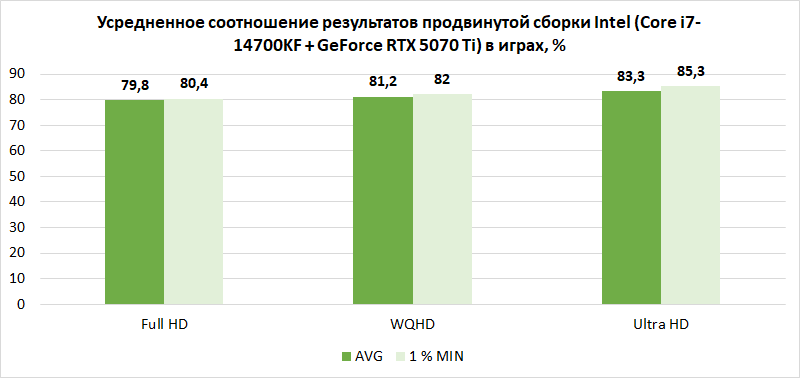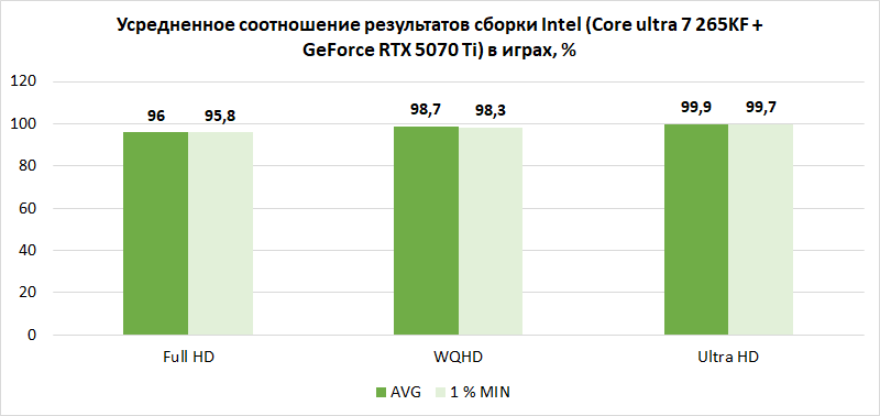 *За 100 % приняты результаты сборки c Core i7-14700KF и GeForce RTX 5070 Ti