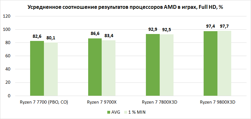 *За 100 % приняты результаты Ryzen 7 9800X3D вкупе с настроенной DDR5-памятью