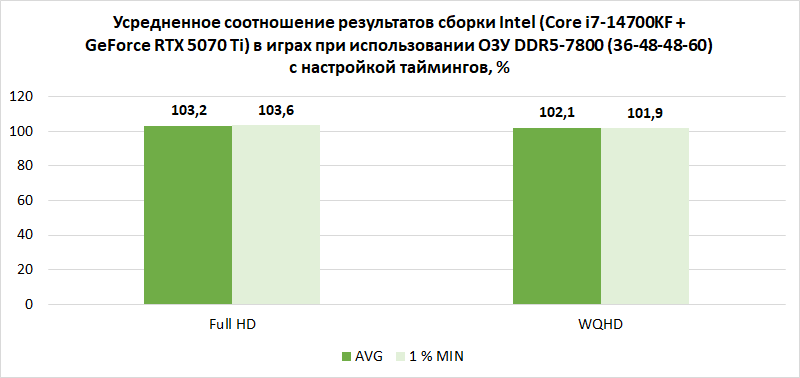 Эти слова относятся и к массовым платформам Intel — в отличие от AMD, чипы Core разных поколений лучше реагируют на увеличение эффективной частоты модулей. Эффект, впрочем, в системе с видеокартой класса GeForce RTX 5070 Ti достигается чисто гомеопатический.