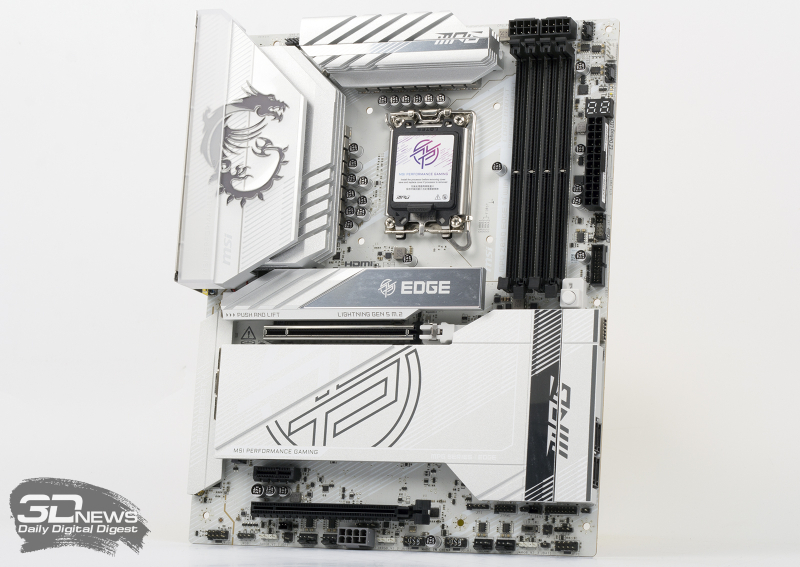 Тестирование LGA1851-сборки проводилось при помощи материнской платы MSI MPG Z890 EDGE TI WIFI. Устройство — топовое и бескомпромиссное, и этим все сказано. На самом деле, материнская плата очень похожа на модель MPG X870E CARBON WIFI. Здесь есть поддержка Thunderbolt 4 и россыпь быстрых USB- портов. Материнка оснащена 5-гигабитным сетевым контроллером и чипом Intel Killer BE1750x с поддержкой Wi-Fi 7. При этом на плате распаяно сразу пять M.2-портов — к основному слоту подведено четыре линии PCI Express 5.0. Все посадочные места оснащены быстросъемными алюминиевыми радиаторами. Наконец, конвертер питания MPG Z890 EDGE TI WIFI работает по схеме «16+1+1+1» — в какой-то степени немного жалко, что для платформы LGA1851 так и не выйдет ни одного центрального процессора, способного по-настоящему нагрузить эту матплату.