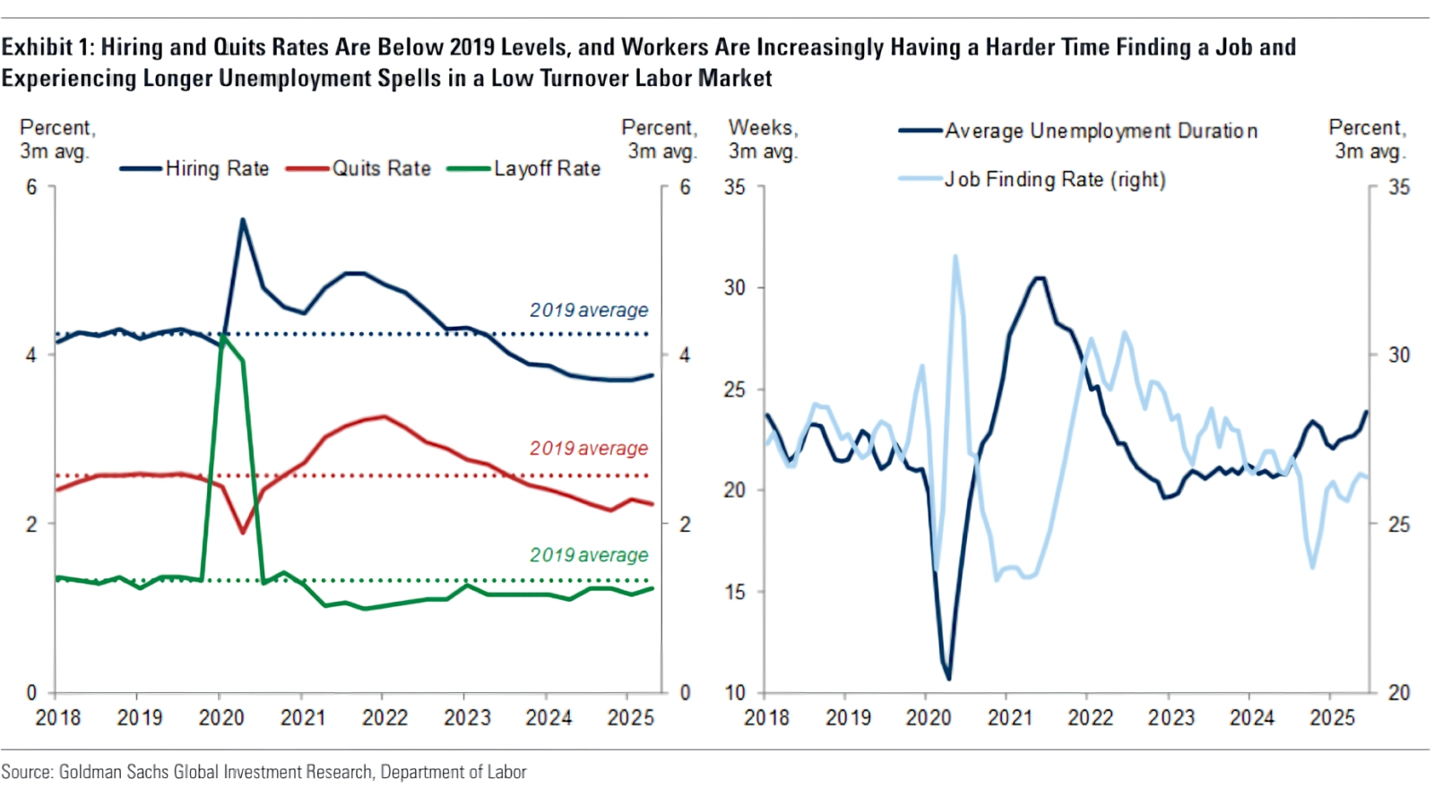 Плачевное актуальное состояние американского рынка труда. Слева: показатели частот найма, оставления работы по собственному желанию и увольнений в сравнении со средними величинами этих параметров для 2019 г.; справа — пульсировавшие почти в противофазе графики средней продолжительности периода временной безработицы и показателя скорости обретения новой работы в 2025-м вдруг стали демонстрировать схожую динамику (источник: Fortune)