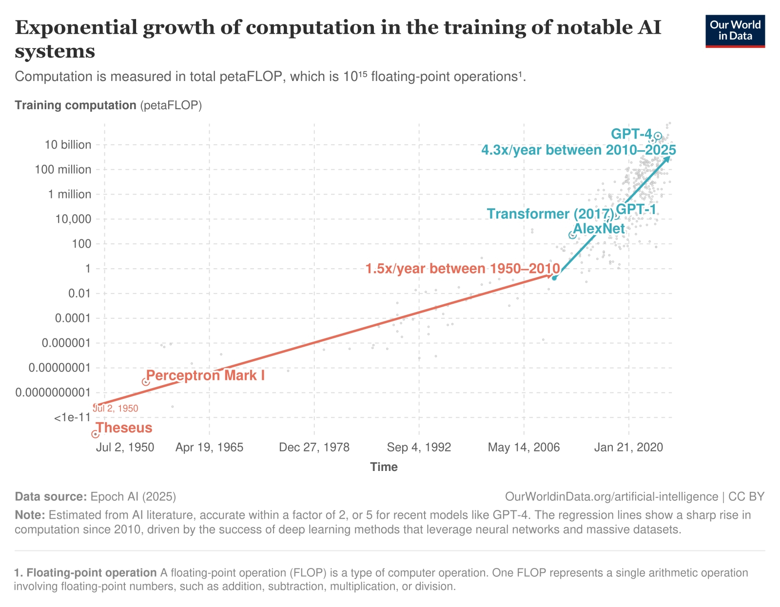Рост вычислительной мощи, выраженной в единицах 10 в 15-й степени операций с плавающей точкой в секунду, требуемой для тренировки наиболее выдающихся ИИ-моделей, на интервале 1950-2010 гг. неплохо аппроксимировался прямой (в логарифмическом масштабе по оси ординат, разумеется) с коэффициентом 1,5 раза в год, тогда как с 2010-го по 2025-й рост это резко ускорился, — до 4,3 раз в год  (источник: OurWorldInData)