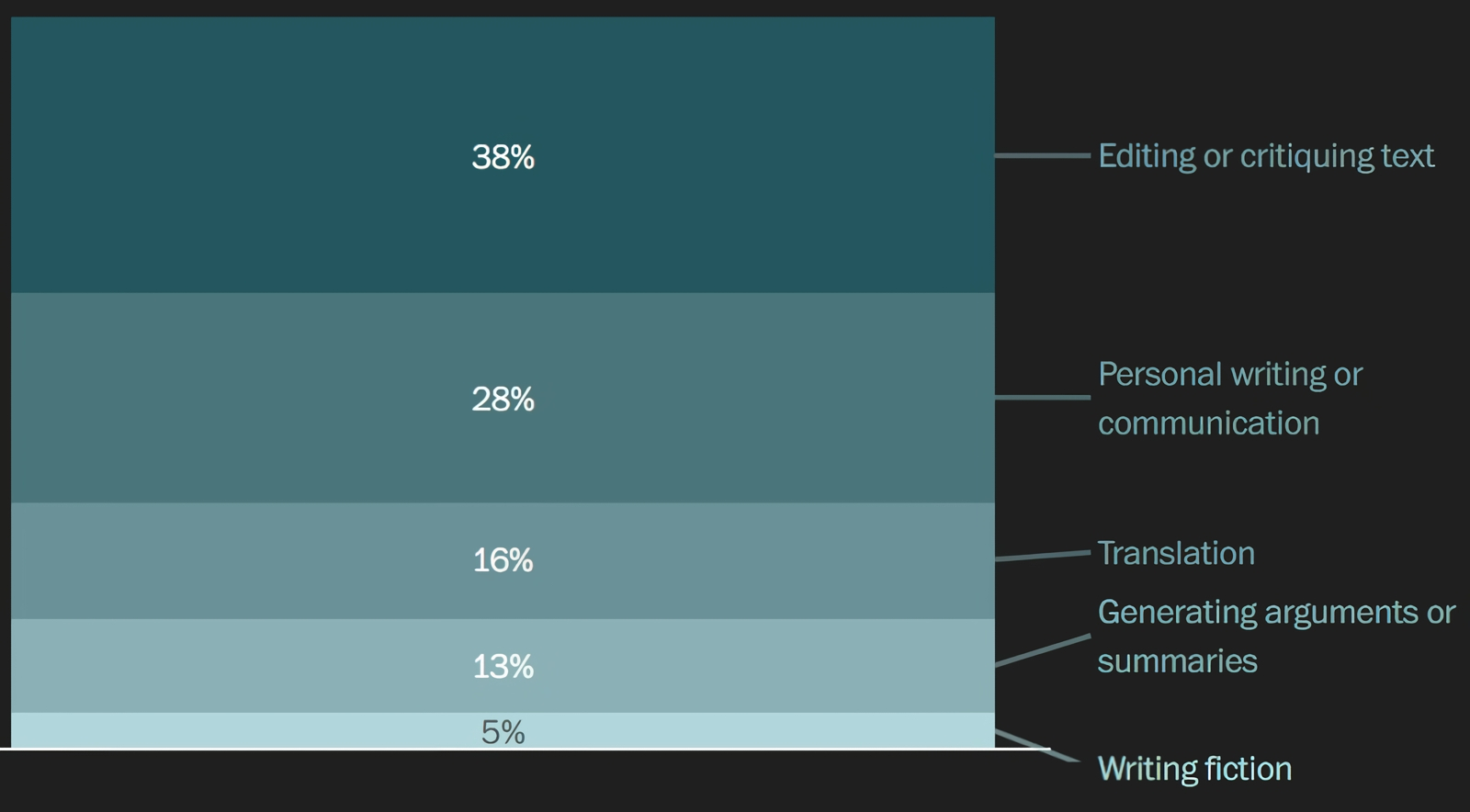 Чаще всего пользователи просят ChatGPT сгенерировать/отредактировать текст. На втором месте — помощь с частной перепиской; далее — перевод, создание краткого резюме и/или выделение основных тезисов. Получить же оригинальный, «из головы придуманный» текст — fiction — жаждут лишь 5% собеседников ИИ-бота (источник: OpenAI)