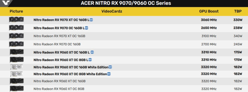 Портал VideoCardz подготовил таблицу, указывающую на различия между обычными моделями видеокарт Acer Nitro и версиями Nitro L. С ней можно ознакомиться ниже.