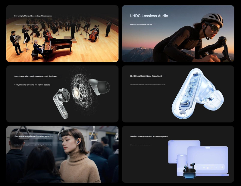 Обе пары наушников оснащены 11-мм динамиками с керамическими вольфрамовыми акустическими мембранами второго поколения, активной функцией шумоподавления 60 дБа с частотой 5500 Гц и микрофонами для ИИ-шумоподавления во время звонков.