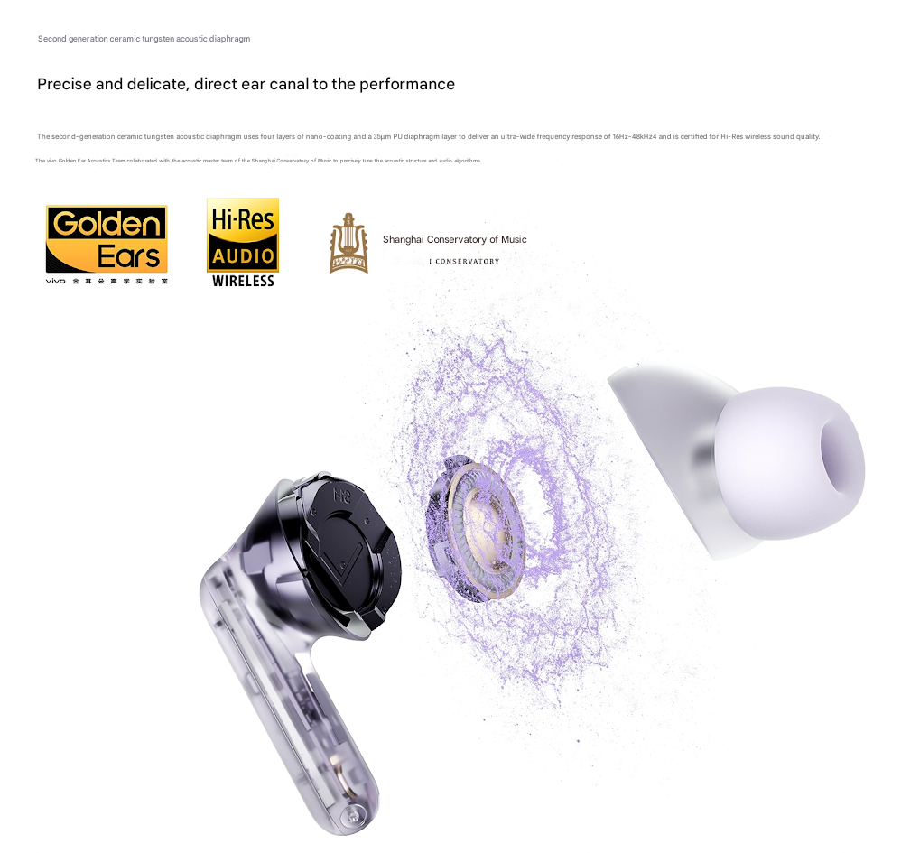 Модель Vivo TWS 5 используют технологию подключения Bluetooth 5.4 LE, поддерживает режим низкой задержки Full-Link 42 мс, а версия Hi-Fi поддерживает высококачественное аудиокодирование LDAC и LHDC 5.0 со скоростью передачи до 1,4 Мбит/с.