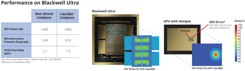 По словам Frore, результаты оказались впечатляющими. LiquidJet поддерживает плотность горячих точек до 600 Вт/см² при температуре на входе 40 °C, что вдвое превосходит показатели стандартных водоблоков. Отношение удаления тепла к скорости потока у LiquidJet увеличено на 50 %, а потери давления снижены в четыре раза — с 0,94 до 0,24 фунта на квадратный дюйм. В результате, по утверждению компании, LiquidJet обеспечивает более низкие температуры и более предсказуемую производительность процессоров Nvidia Blackwell Ultra при полной нагрузке.