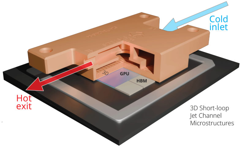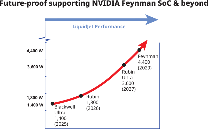 Компания Frore Systems представила LiquidJet — водоблок системы жидкостного охлаждения (СЖО), поддерживающий существующие графические процессоры для ИИ, такие как Nvidia Blackwell, с тепловой мощностью 1400 Вт. Производительность LiquidJet может быть масштабирована для ускорителей ИИ следующего поколения, включая Nvidia Feynman, общая мощность которых составит до 4400 Вт.