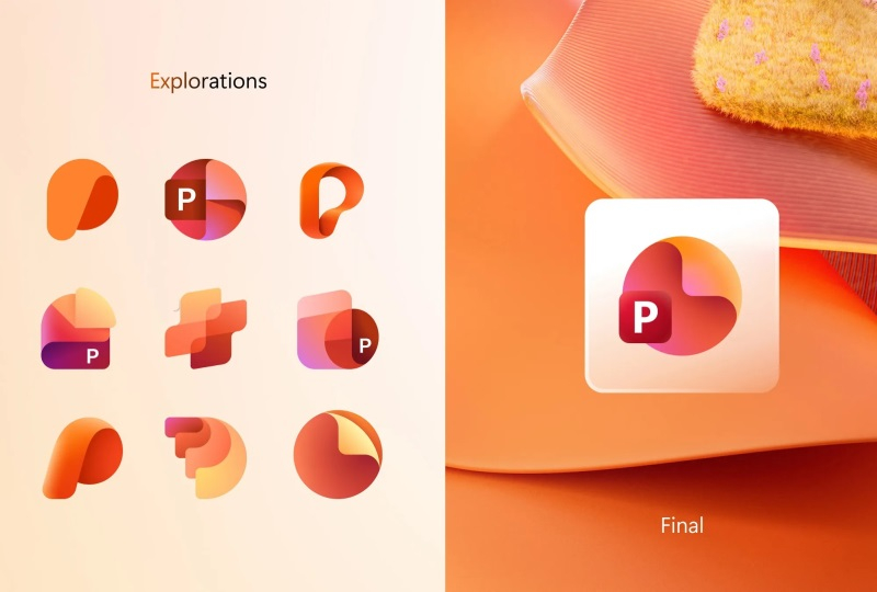 В PowerPoint всегда использовались слайды, поэтому Microsoft пробовала по-разному визуализировать этот элемент в новой иконке приложения. В нескольких концептах основное внимание уделяется текстовому названию, превращённому в букву P. Однако окончательный вариант иконки оказался более простым, с чуть более округлым и красочным оформлением.