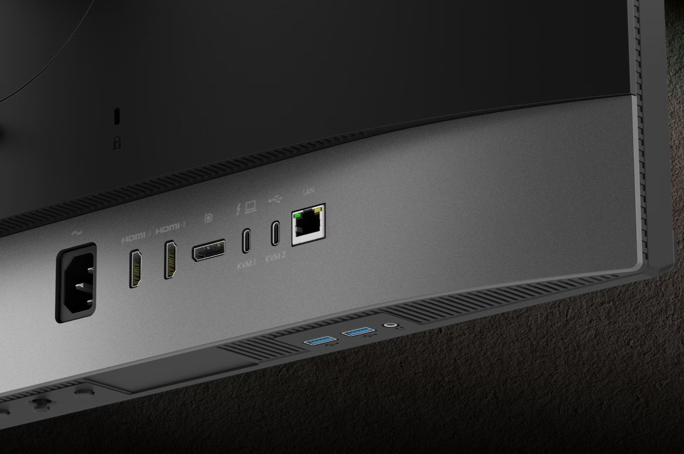 Монитор оснащён двумя портами HDMI 2.0, одним DisplayPort 1.4, одним USB-C с функциями зарядки мощностью 90 Вт и DisplayPort, одним сетевым портом LAN, а также концентратором USB с одним восходящим USB 3.2 Gen1 Type-C (5 Гбит/с) и двумя нисходящими USB 3.2 Gen1 Type-A (5 Гбит/с, зарядка 4,5 Вт).