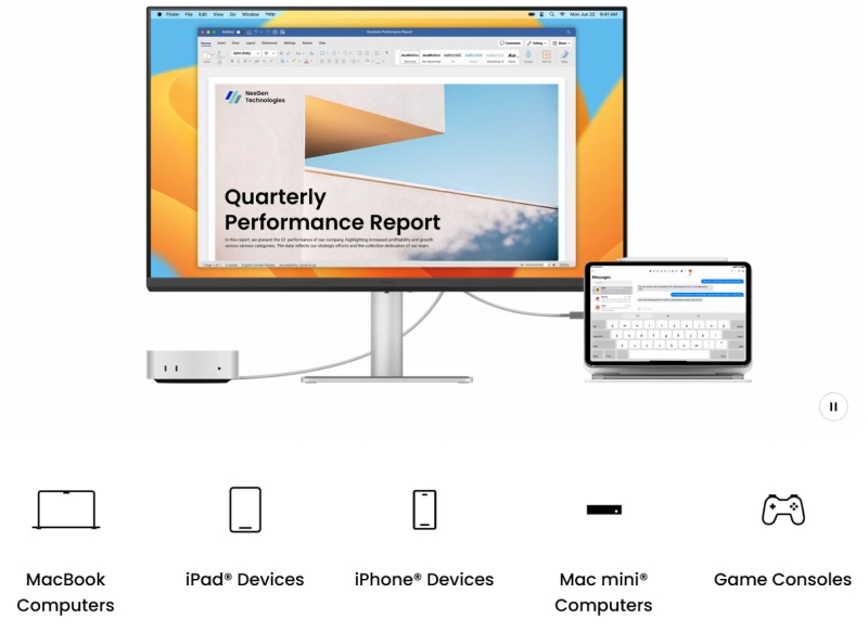В оснащение монитора входят два порта HDMI 2.0, один USB-C с функциями зарядки мощностью 90 Вт и DisplayPort, а также концентратор USB с одним нисходящим USB 3.2 Gen1 Type-C (5 Гбит/с, зарядка 15 Вт) и двумя нисходящими USB 3.2 Gen1 Type-A (5 Гбит/с, зарядка 7,5 Вт). Также имеются пара динамиков мощностью по 3 Вт, 3,5-мм аудиовыход и эргономичная подставка с регулировкой высоты, углов наклона и поворота дисплея.